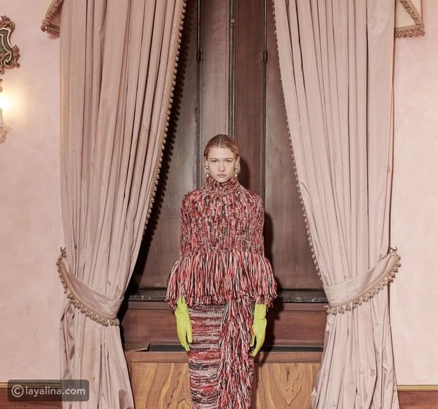 - وتظهر ملامح هذا التوتر الجمالي بوضوح في دليل الإطلالات المصوَّر داخل قصر ميلاني فخم، حيث الجدران المزخرفة والأسقف المذهّبة تشكّل خلفية لملابس تبدو وكأنها لا تخضع لقواعد الفضاء الذي تُعرض داخله.