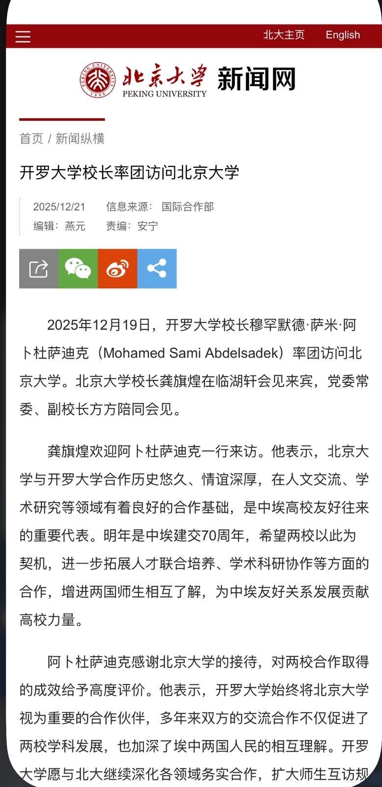 لقاءات رئيس جامعة القاهرة بقيادات جامعة بكين ومؤسسات التعليم الصينى تمثل نموذجا للشراكة التعليميةكما تناولت التغطيات الإعلامية، لقاءات د.محمد سامى عبدالصادق رئيس جامعة القاهرة مع قيادات جامعة بكين، والمؤسسة الصينية للتعليم الدولي للغة الصينية، ومركز التبادل الدولي للتعليم اللغوي، كما أثنى الجانب الصيني على الدور الريادي الذي تقوم به جامعة القاهرة ومعهد كونفوشيوس في نشر وتعليم اللغة والثقافة الصينية، وأكدت أن هذه اللقاءات تمثل نموذجًا متميزًا للشراكة التعليمية الدولية وتعكس عمق العلاقات التاريخية والأكاديمية بين مصر وجمهورية الصين الشعبية.