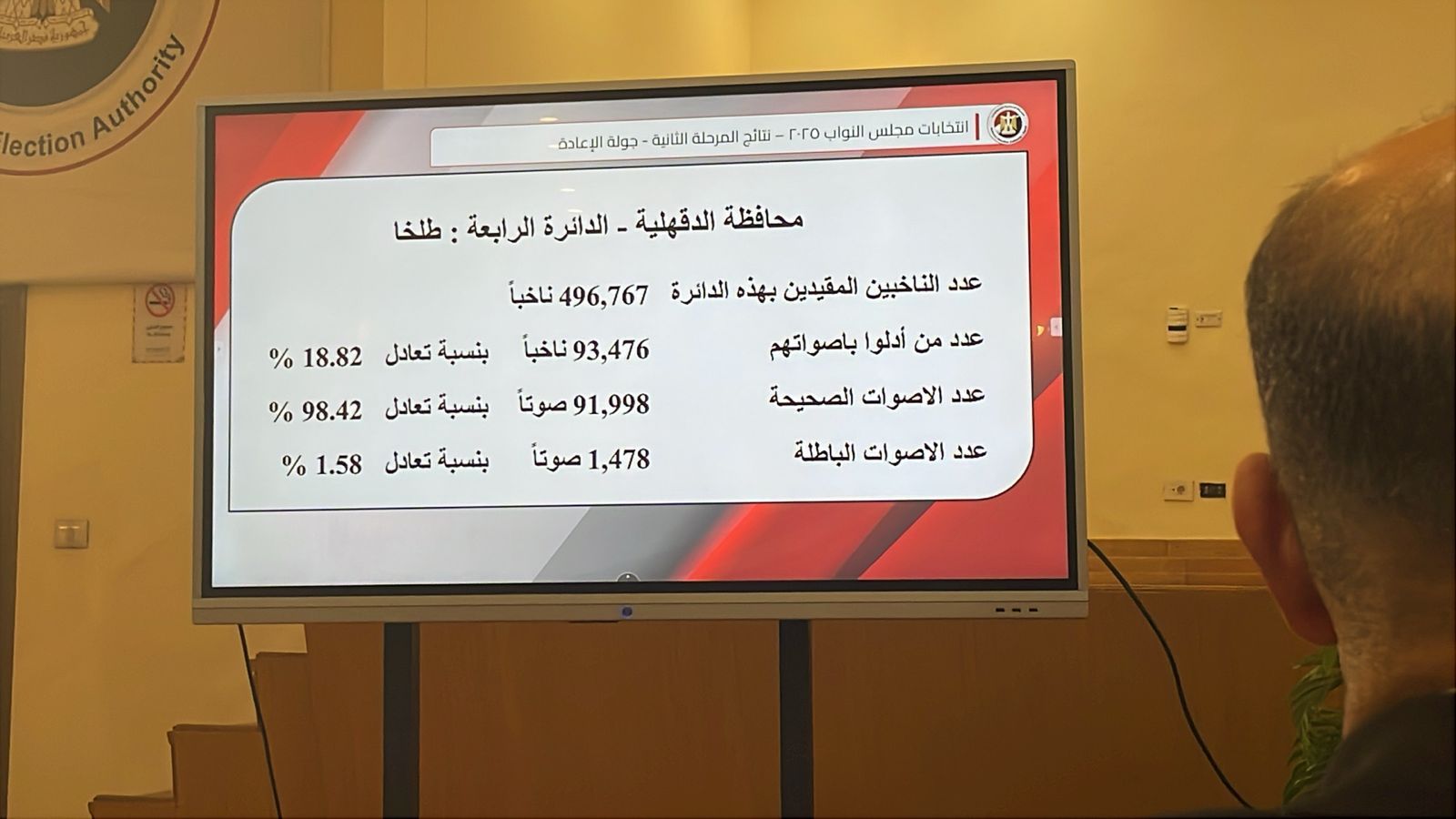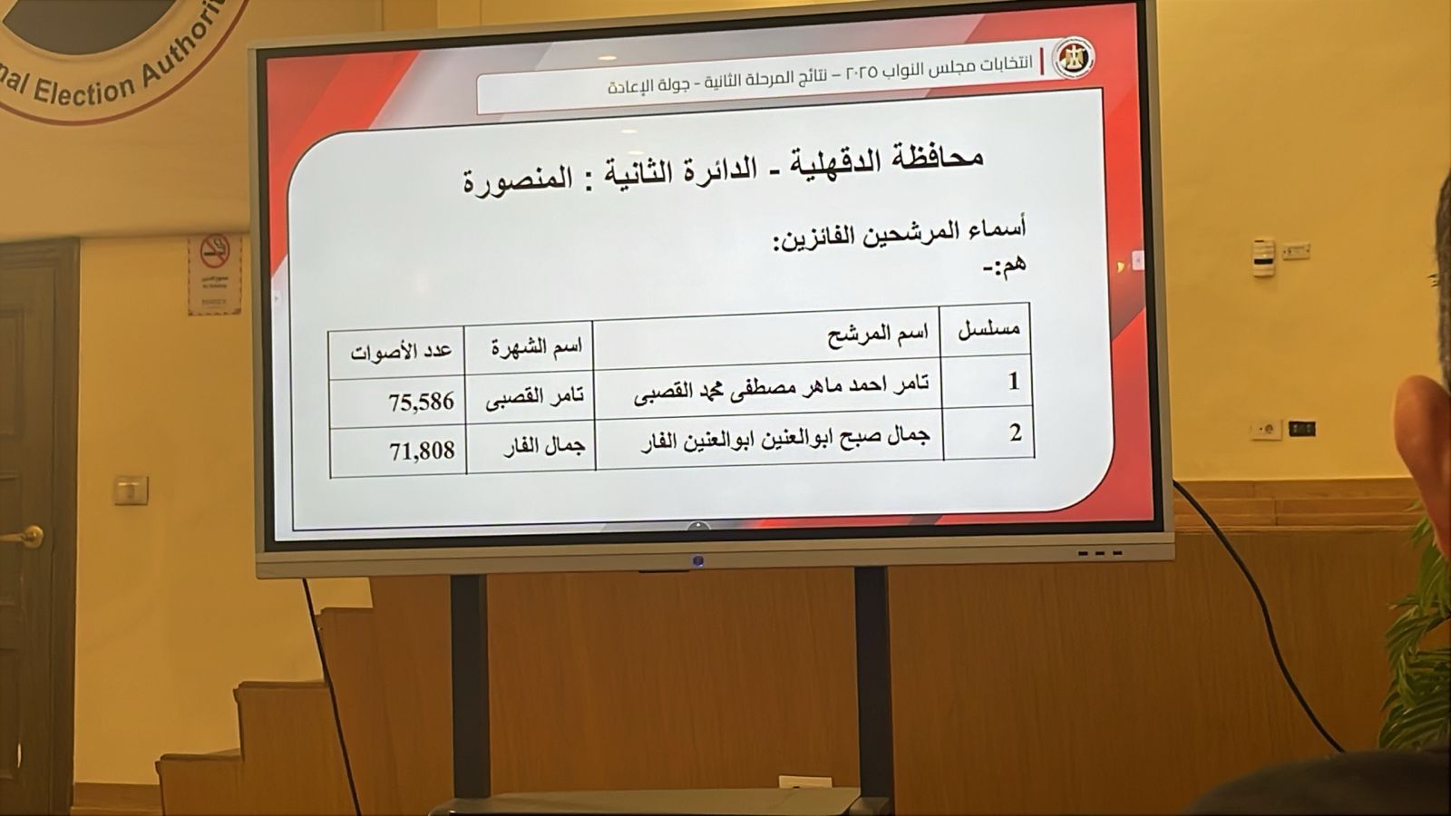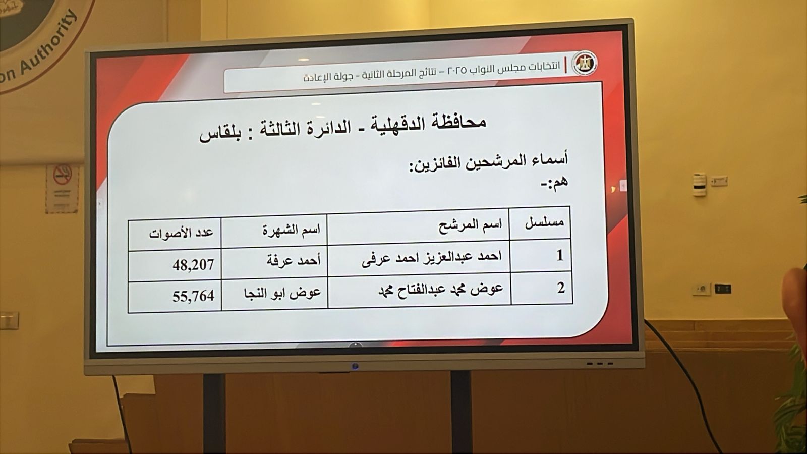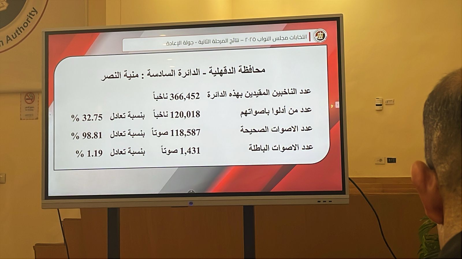 الخميس، 25 ديسمبر 2025 02:22 مأعلنت الهيئة الوطنية للانتخابات، برئاسة القاضي حازم بدوى، نتيجة جولة الإعادة بالمرحلة الثانية من انتخابات مجلس النواب، وجاءت نتيجة محافظة الدقهلية كالتالي: