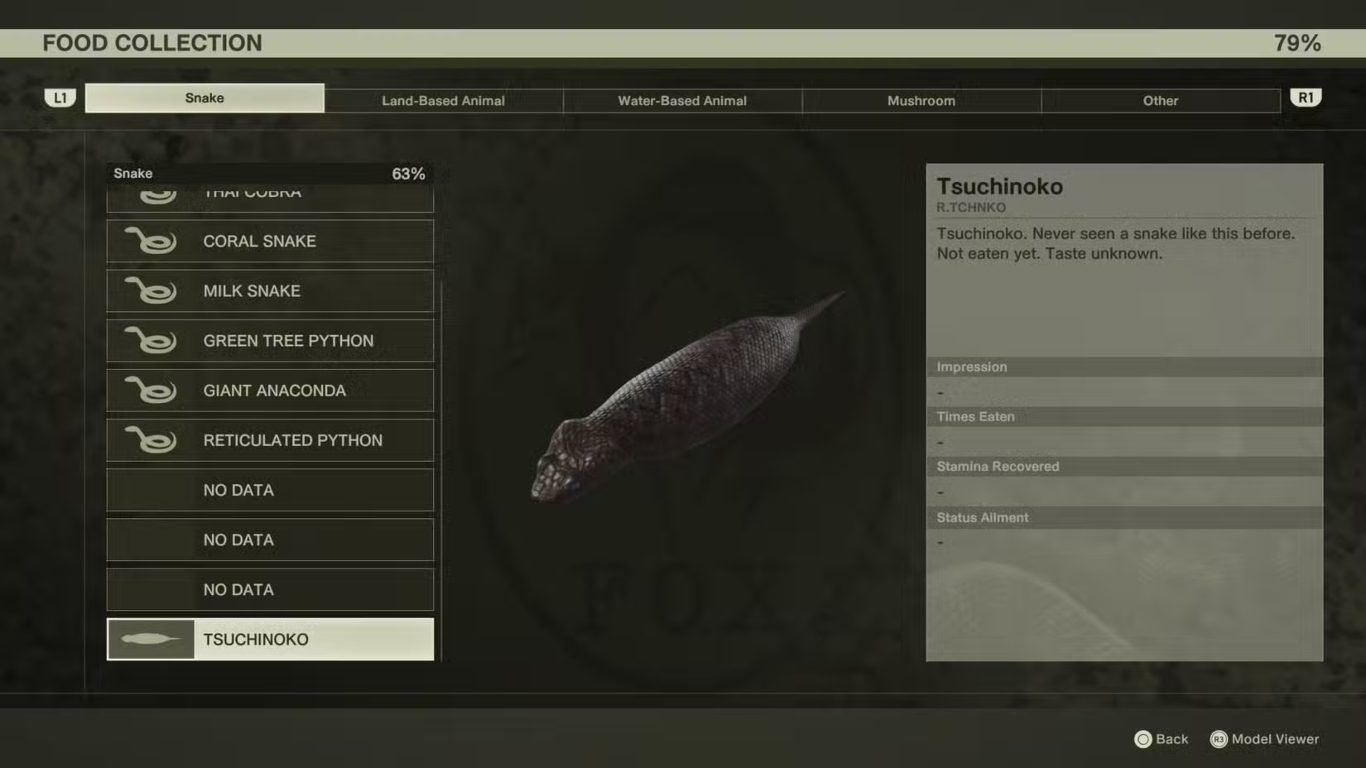 يوجد Tsuchinoko واحد فقط في اللعبة، لذلك يجب عدم تناوله. يؤدي الوصول إلى نهاية Metal Gear Solid Delta Snake Eater مع وجود Tsuchinoko داخل الحقيبة إلى فتح طلاء الوجه Infinity الذي يمنح ذخيرة غير محدودة. تُعد هذه المكافأة من أندر المكافآت في MGS Delta، لذلك يجب الاحتفاظ بهذا الثعبان الأسطوري مهما كان الثمن.