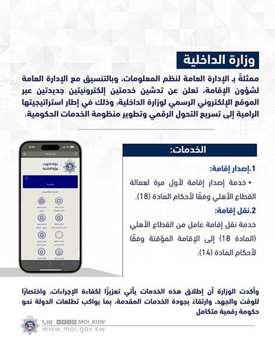 • إصدار إقامة لأول مرة لعمالة القطاع الأهلي، وفقًا لأحكام المادة (18). • نقل إقامة عامل من القطاع الأهلي (المادة 18) إلى الإقامة المؤقتة، وفقًا لأحكام المادة (14).وأكدت الوزارة أن إطلاق هذه الخدمات يأتي ضمن جهودها المستمرة لتعزيز التحول الرقمي، وتسريع إنجاز المعاملات، وتحسين مستوى الخدمات المقدمة للمستفيدين.ملحوظة: مضمون هذا الخبر تم كتابته بواسطة بوابة المصريين في الكويت ولا يعبر عن وجهة نظر مصر اليوم وانما تم نقله بمحتواه كما هو من بوابة المصريين في الكويت ونحن غير مسئولين عن محتوى الخبر والعهدة علي المصدر السابق ذكرة.