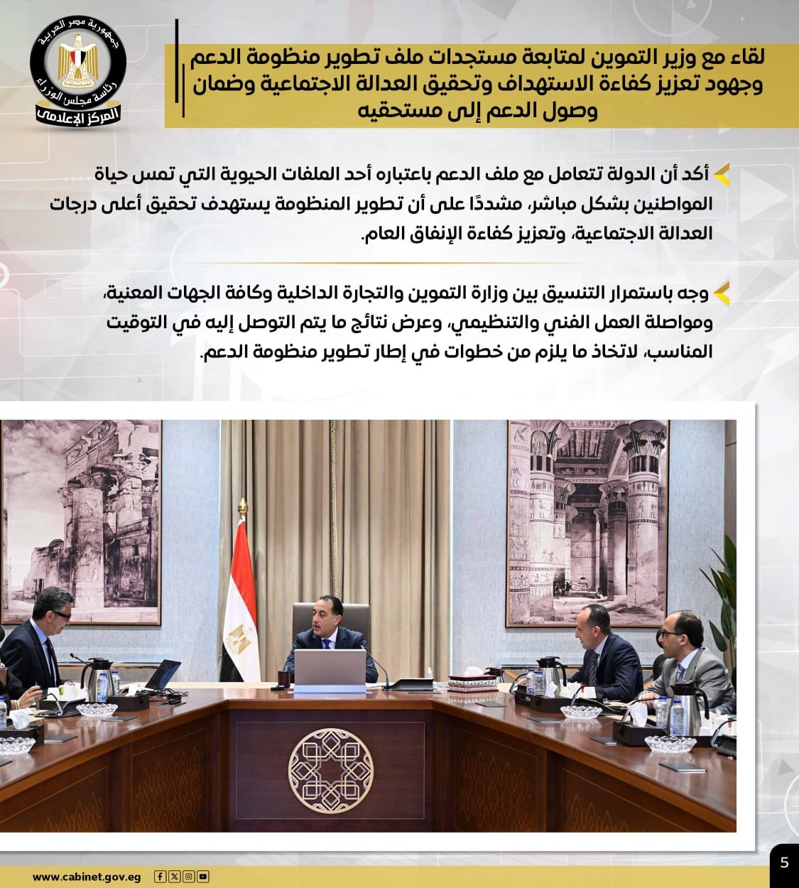 كما التقى سيادته مع وزير التموين، لمتابعة مستجدات ملف تطوير منظومة الدعم، وضمان وصول الدعم إلى مستحقيه، مؤكدًا أن الدولة تتعامل مع ملف الدعم كأحد الملفات الحيوية التي تمس حياة المواطنين بشكل مباشر، موجهًا باستمرار التنسيق بين وزارة التموين وكافة الجهات المعنية، مع مواصلة العمل الفني والتنظيمي، وعرض نتائج ما يتم التوصل إليه في التوقيت المناسب، لاتخاذ ما يلزم من خطوات في إطار تطوير منظومة الدعم.