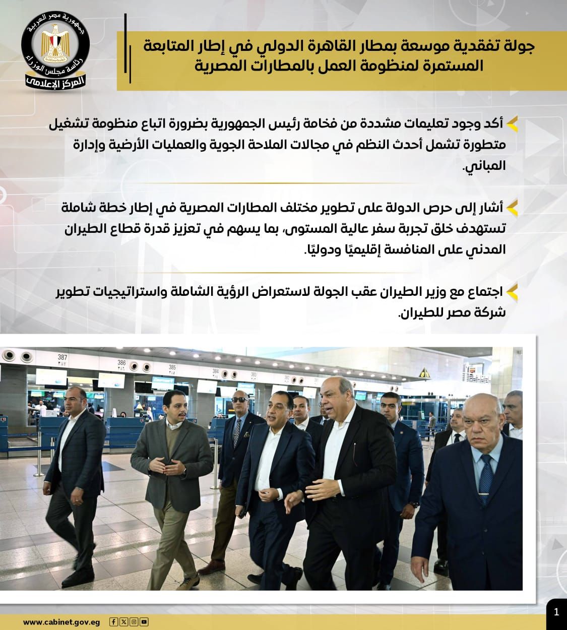وتضمنت الأنشطة، إجراء رئيس الوزراء جولة تفقدية موسعة بمطار القاهرة الدولي، حيث أكد على وجود تعليمات مشددة من فخامة الرئيس بضرورة اتباع منظومة تشغيل متطورة تشمل أحدث النظم في مجالات الملاحة الجوية والعمليات الأرضية وإدارة المباني، كما اجتمع مع وزير الطيران عقب الجولة، لاستعراض الرؤية الشاملة واستراتيجيات تطوير شركة مصر للطيران.