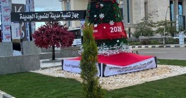 تستعد مدينة المنصورة الجديدة، لاستقبال العام الجديد 2026، من خلال تزين الميادين بأشجار الكريسماس والزينة المختلفة، في ميادين المدينة