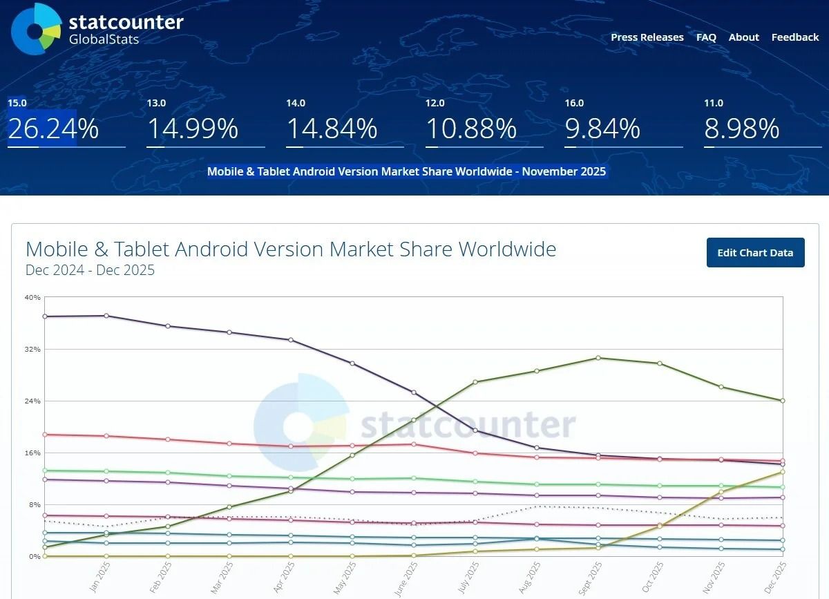 كشف تقرير حديث لموقع StatCounter، أن أكثر من 30% من مستخدمي أندرويد حول العالم يستخدمون نظام أندرويد 13 أو إصدارًا أقدم على هواتفهم، وهذا الإصدار من نظام تشغيل جوجل للهواتف المحمولة صدر لأول مرة عام 2022، وهذا يعني، بحسب أحد الإحصاءات، أن ما يقارب مليار مستخدم أندرويد يستخدمون حاليًا هواتف فقدت دعم جوجل ولا يمكن تحديثها، ولا تحظي بأي دعم أمني مباشر من الشركة.