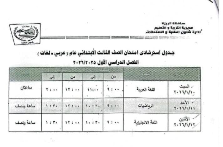 جدول امتحانات طلاب الصف الثالث الابتدائيوتعقد امتحانات الفصل الدراسي الأول لطلاب الصف الثالث الابتدائي (عام – مكفوفون – صم وضعاف السمع) في الفترة من السبت 10/1/2026 إلى الإثنين 12/1/2026، وذلك على النحو التالي: