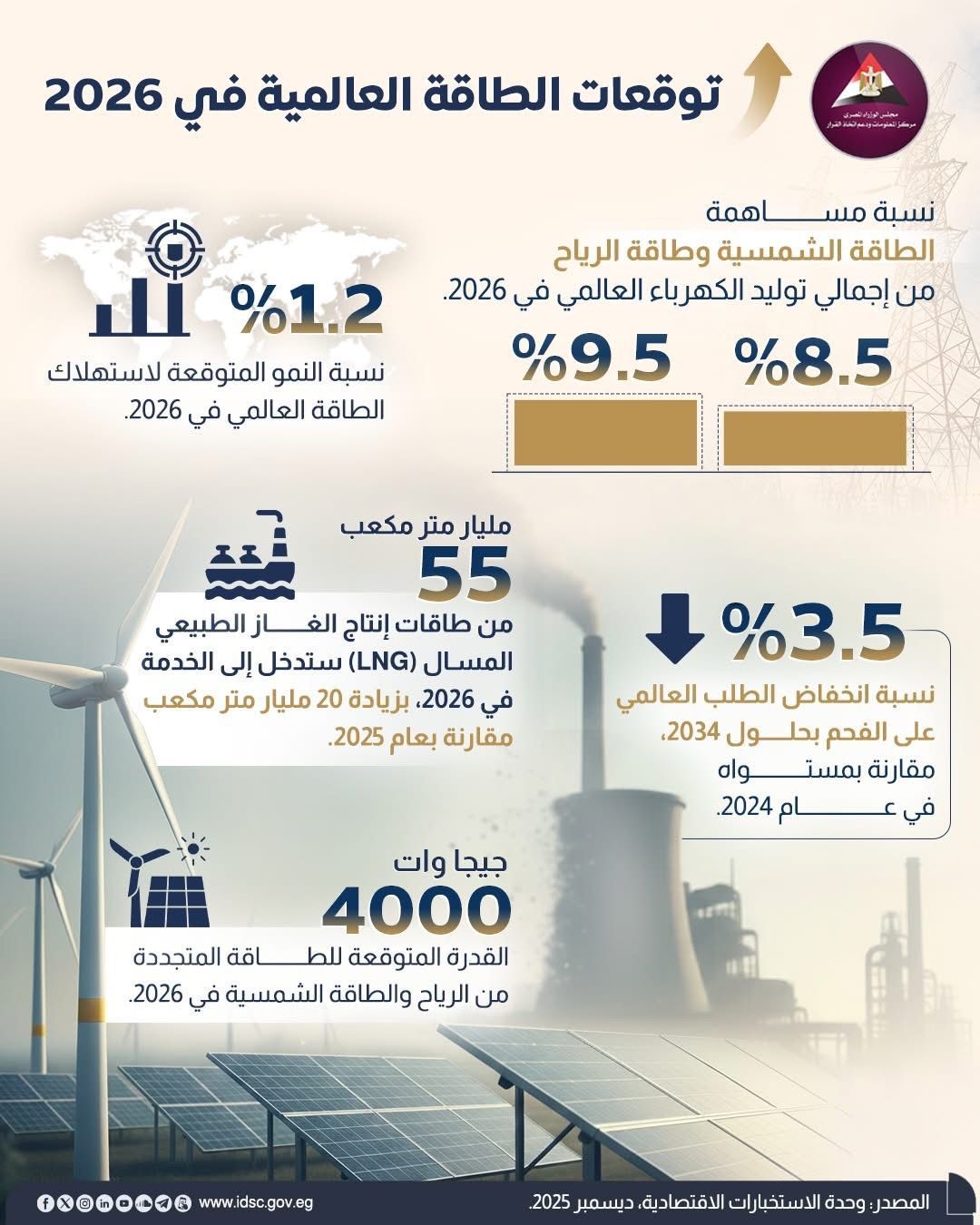 توقع مركز معلومات مجلس الوزراء أن ينمو استهلاك الطاقة العالمي بنسبة 1.2% في 2026، مع وصول قدرات الطاقة المتجددة من الرياح والطاقة الشمسية إلى نحو 4 آلاف جيجاوات.