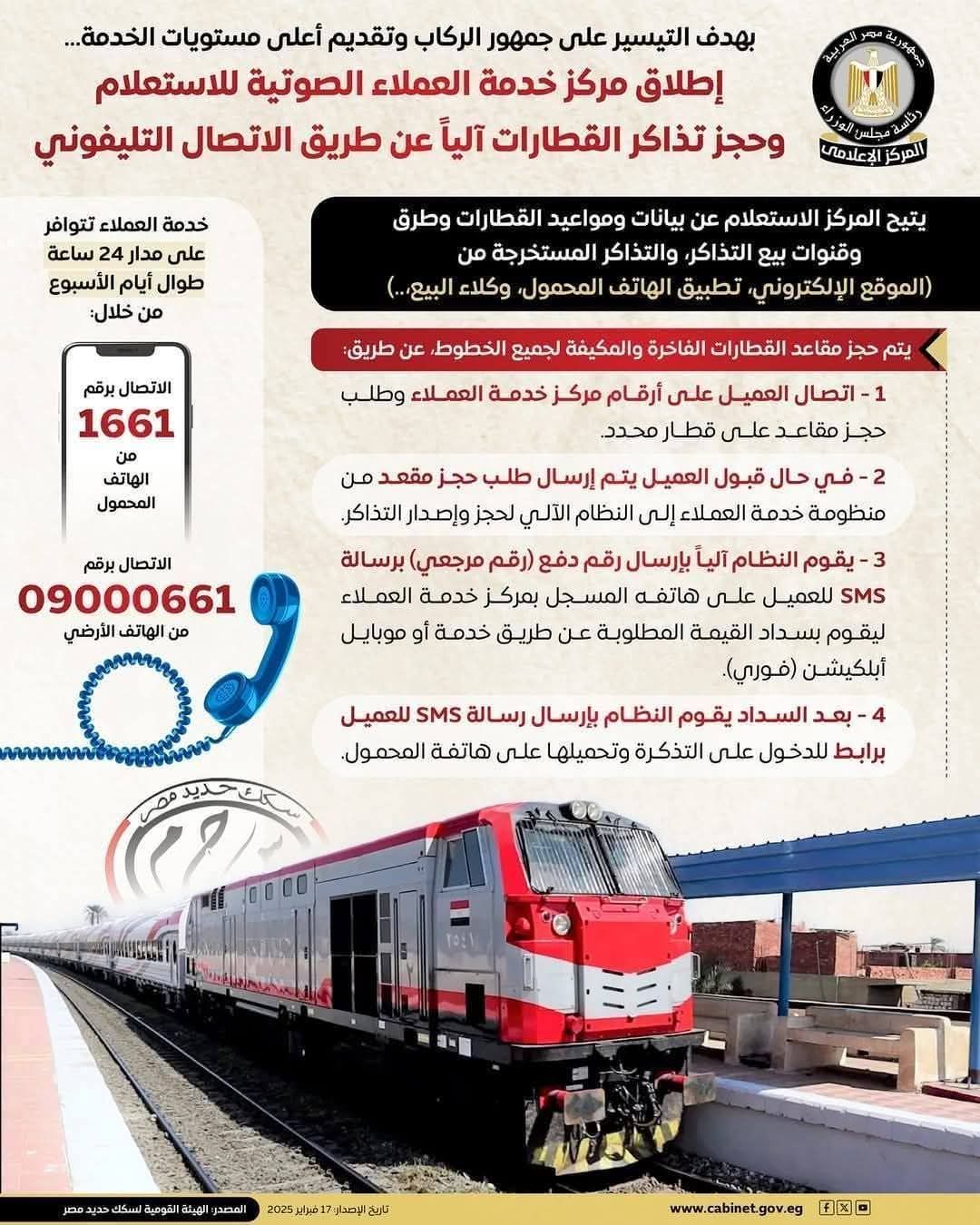 الإثنين، 29 ديسمبر 2025 10:36 مأطلقت الهيئة القومية لسكك حديد مصر مركز خدمة العملاء الصوتية المتطور، والذي يتيح للجمهور إمكانية الاستعلام وحجز تذاكر القطارات آلياً من خلال اتصال تليفوني بسيط. تأتي هذه الخطوة لتطوير مستوى الخدمة وتوفير أقصى درجات الراحة والتيسير على جمهور الركاب في مختلف محافظات الجمهورية.