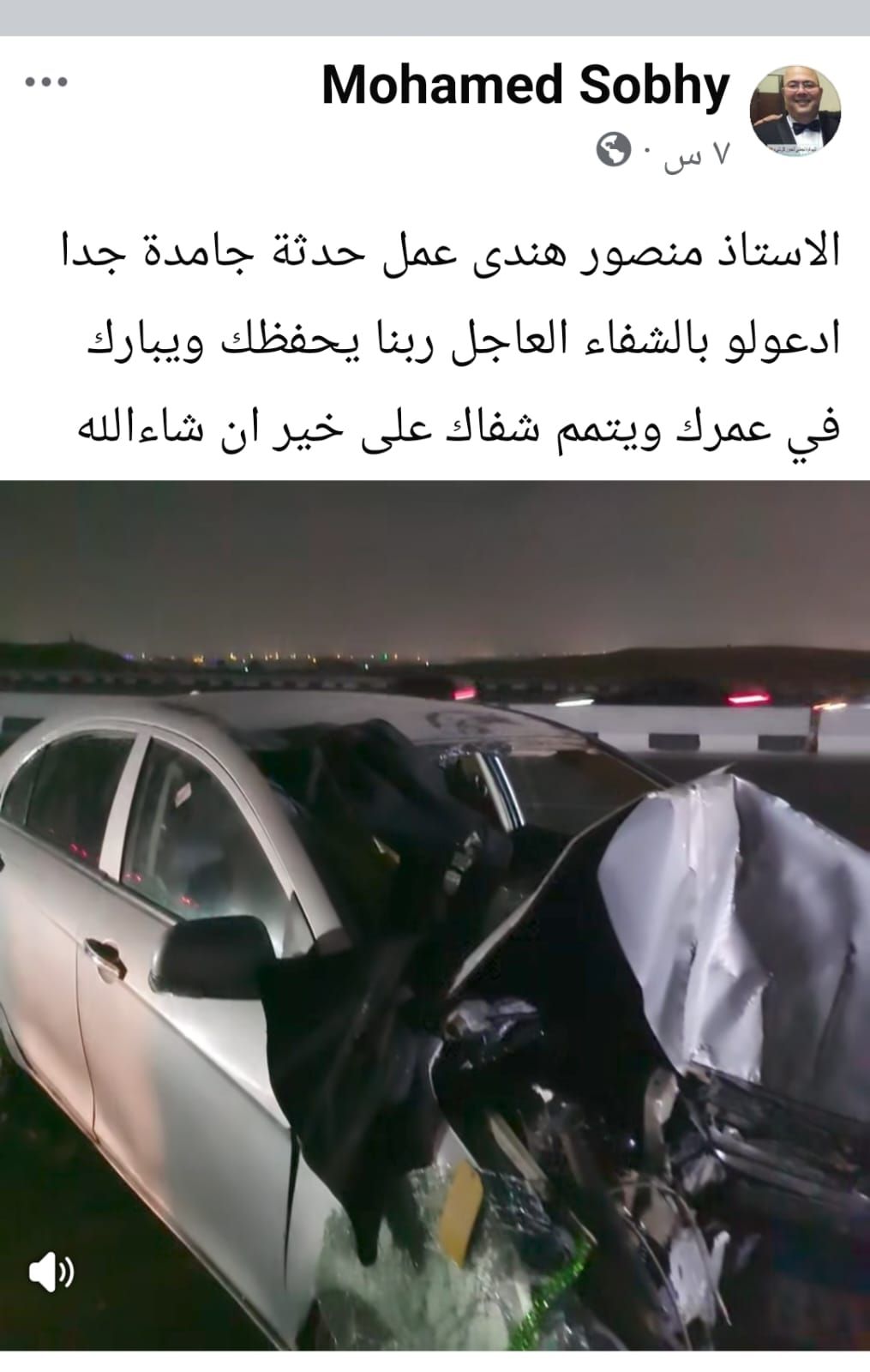 تعرض منصور هندى، عضو نقابة المهن الموسيقية، لحادث سير مساء أمس، نتيجة اصطدام مركبته.