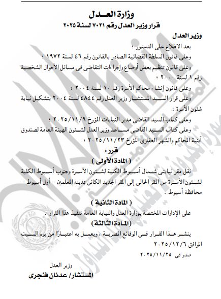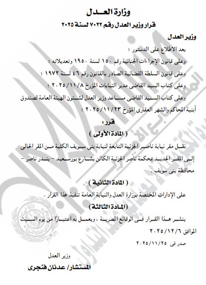 الثلاثاء، 30 ديسمبر 2025 09:49 صنشرت الجريدة الرسمية اليوم قرار المستشار عدنان فنجرى وزير العدل بنقل مقر نيابتي شمال أسيوط الكلية لشئون الأسرة وجنوب أسيوط الكلية لشئون الأسرة من المقر الحالي إلى المقر الجديد الكائن بمدينة المعلمين - أول أسيوط - بمحافظة أسيوط، ونقل مقر نيابة ناصر الجزئية التابعة لنيابة بنى سويف الكلية من المقر الحالي إلى المقر الجديد بمحكمة ناصر الجزئية الكائن بشارع بورسعيد - بندر ناصر -محافظة بني سويف.