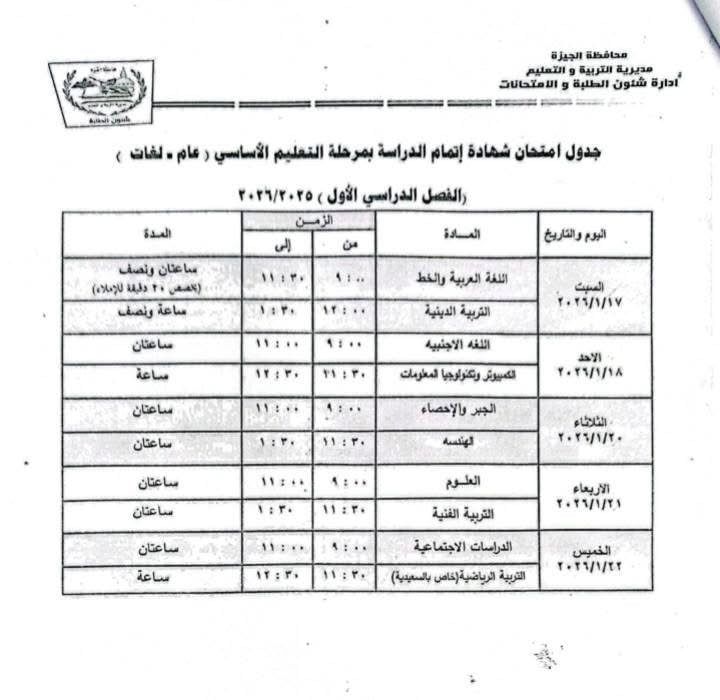اعتمدت محافظة الجيزة جداول امتحانات الفصل الدراسي الأول لطلاب صفوف النقل والشهادة الإعدادية، موضحة جدول امتحانات طلاب الشهادة الإعدادية على النحو التالي: