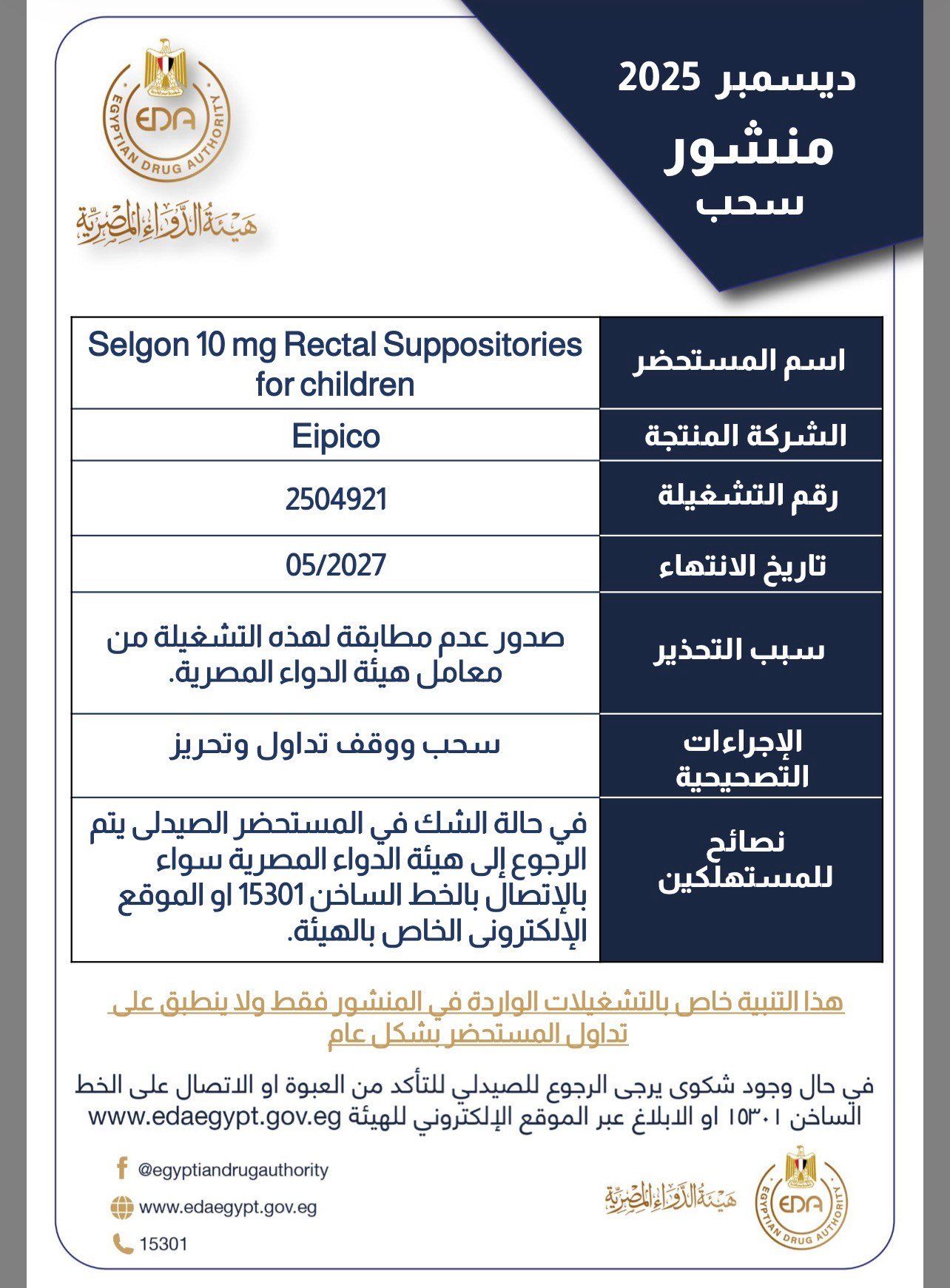 الخميس، 01 يناير 2026 01:51 مأصدرت هيئة الدواء المصرية منشور بسحب ووقف تداول وتحريز مستحضر Selgon 10 mg Rectal Suppositories for children .