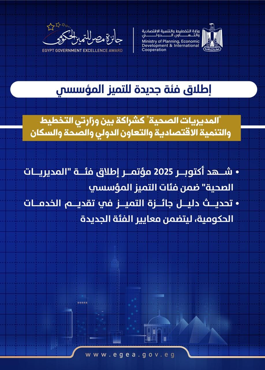 ثانياً: إطلاق فئة جديدة للتميز المؤسسي: “المديريات الصحية” كشراكة بين وزارتي التخطيط والتنمية الاقتصادية والتعاون الدولي والصحة والسكان:شهد أكتوبر 2025 مؤتمر إطلاق فئة "المديريات الصحية" ضمن فئات التميز المؤسسي في إطار الشراكة بين وزارتي التخطيط والتنمية الاقتصادية والتعاون الدولي والصحة والسكان. لذا تم إعداد وتحديث دليل جائزة التميز في تقديم الخدمات الحكومية، بما يضمن مواءمته مع استحداث فئة المديريات الصحية، وتضمينه المعايير والمؤشرات التى تعكس خصوصية هذا القطاع وأولوياته.