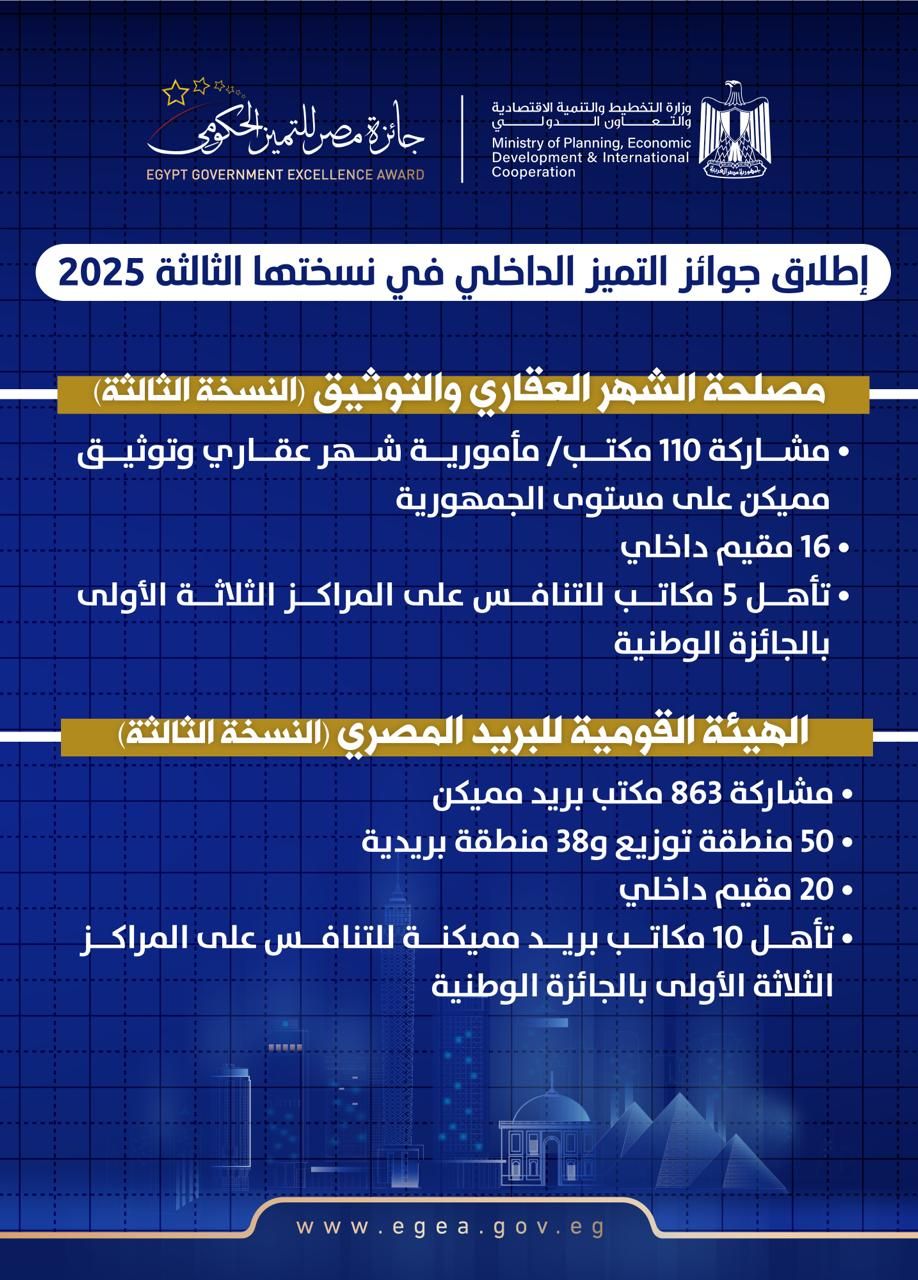 الهيئة القومية للبريد المصري (النسخة الثالثة): كما شهد 2025 مشاركة 863 مكتب بريد مميكن، 50 منطقة توزيع و38 منطقة بريدية، بمشاركة 20 مقيم داخلي معتمد تحت إشراف 3 رؤساء فرق ولجان جودة من جائزة مصر للتميز الحكومي. وتأهل 10 مكاتب بريد مميكنة للتنافس على المراكز الثلاثة الأولى بالجائزة الوطنية في دورتها القادمة 2026.