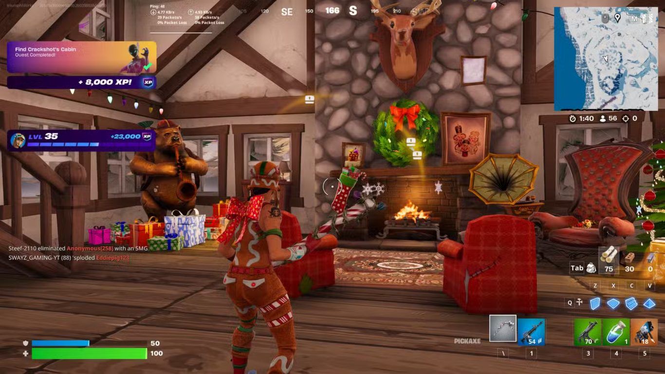 على النقيض تماما يظهر داخل Crackshot’s Cabin كمساحة دافئة ومريحة بشكل لافت. المدفأة مشتعلة وتبعث حرارة واضحة تضيف إحساسا بالأمان بعد البرد القارس في الخارج. الهدايا موضوعة بعناية داخل الكوخ مما يعزز الطابع الاحتفالي ويربط الموقع بروح الشتاء والأعياد التي ميزت هذا الموسم الكلاسيكي.