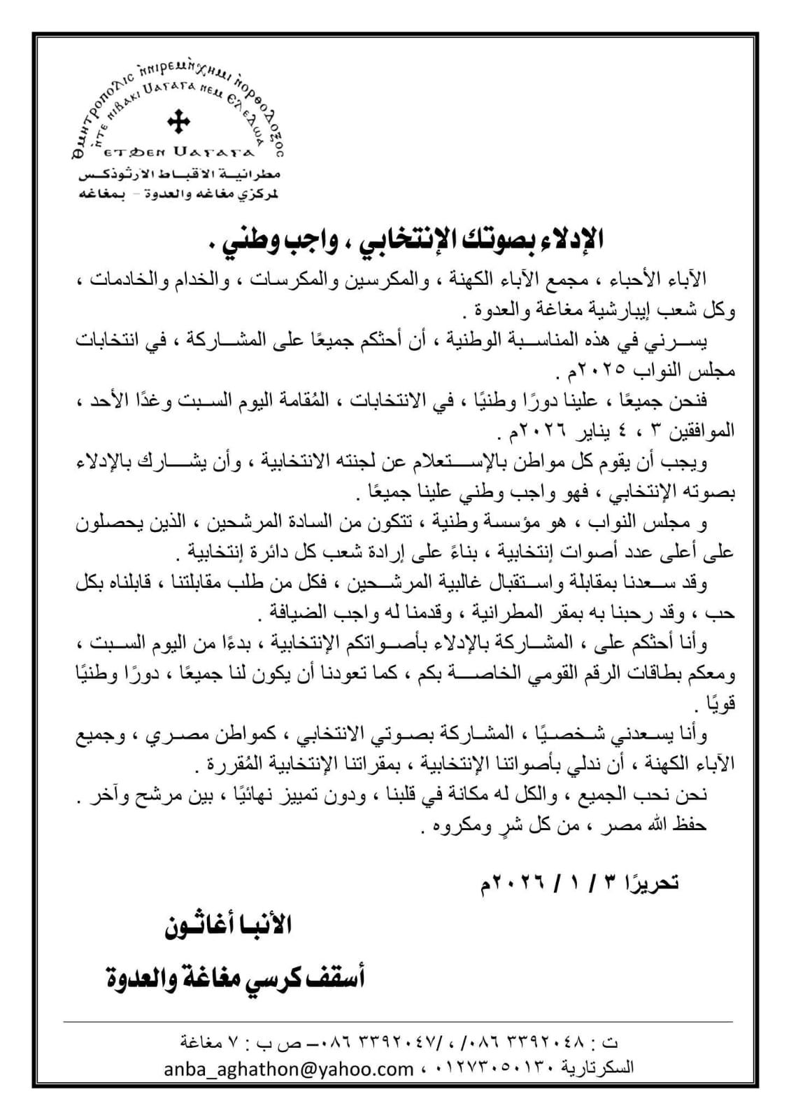 المشاركة واجب وطنيوأكد نيافة الأنبا أغاثون، في بيان رسمي صدر عن مطرانية الأقباط الأرثوذكس بمغاغة والعدوة، أن المشاركة في الانتخابات المقررة تمثل دورًا وطنيًا مهمًا لكل مواطن، داعيًا الجميع إلى الاستعلام عن لجانهم الانتخابية، والتوجه للإدلاء بأصواتهم باستخدام بطاقات الرقم القومي.