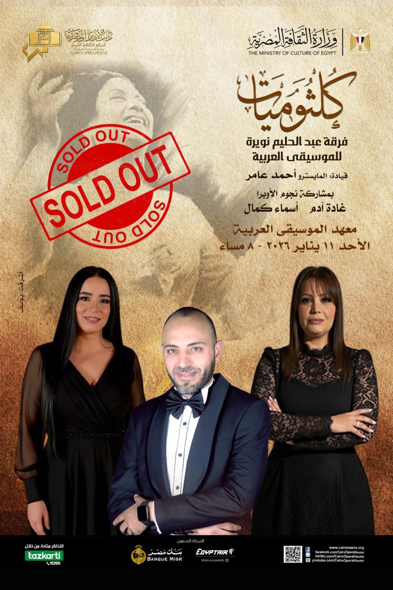 كشفت دار الأوبرا المصرية عن نفاد تذاكر حفل " كلثوميات " الذى سيقام على مسرح معهد الموسيقى العربية يوم الاحد الموافق 11 يناير الجارى وسيقدم الحفل فرقة عبد الحليم نويرة، وستقدم أجمل أغاني كوكب الشرق ام كلثوم تحت قيادة المايسترو أحمد عامر، وبمشاركة نجمتا دار الاوبرا غادة ادم واسماء كمال وتأتي حفلات كلثوميات تأتى تخليدًا لسيدة الغناء العربى أم كلثوم وضمن جهود الأوبرا لإحياء تراث الموسيقى العربية ونشره للأجيال الجديدة والشباب باعتباره جزءًا أصيلاً من تاريخ مصر الثقافى والحضاري.