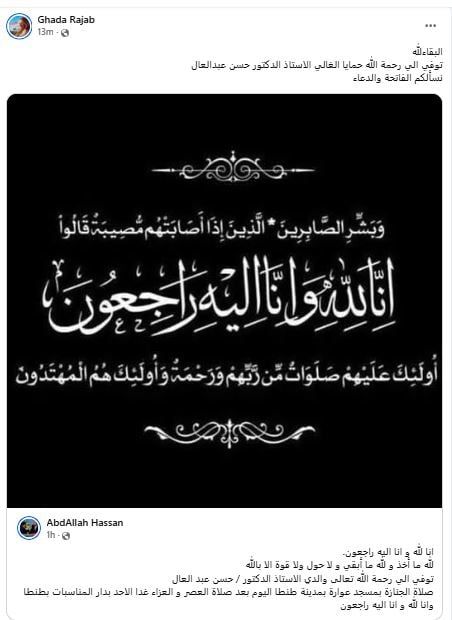أعلن الشاعر الغنائي عبد الله حسن، وفاة والده الدكتور حسن عبد العال، حما الفنانة غادة رجب، حيث كتب عبر حسابه على "فيس بوك": "انا لله وانا اليه راجعون، لله ما أخذ ولله ما أبقي ولا حول ولا قوة الا بالله، توفي الي رحمة الله تعالى والدي الاستاذ الدكتور حسن عبد العال ".