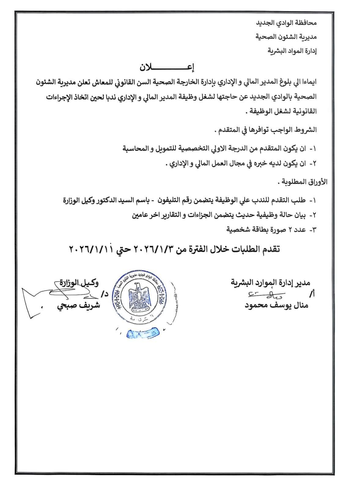 السبت، 03 يناير 2026 11:48 مأعلنت مديرية الشئون الصحية بالوادي الجديد عن حاجتها لشغل وظيفة المدير المالي والإداري ندبًا، لحين اتخاذ الإجراءات القانونية لشغل الوظيفة، وذلك إيماءً إلى بلوغ المدير المالي والإداري بإدارة الخارجة الصحية السن القانوني للمعاش، على أن تُقدم الطلبات خلال الفترة من 3 / 1 / 2026 وحتى 11 / 1 / 2026.
