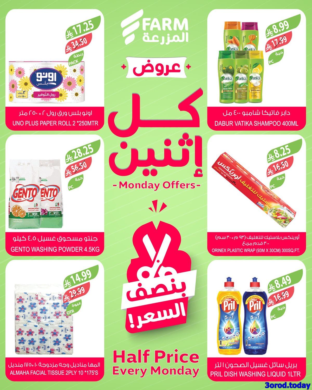 بنستعرض معاكم عروض المزرعة الاثنين 5 يناير 2026 الموافق 16 رجب 1447هـ و بتحتوي علي منتجات متنوعة منها غذائية كالخضروات و الفواكه و اللحوم و مستلزمات تحضير الطعام و منها الكترونية و ادوات المطبخ الضرورية في تجهيز الطعام و العرض متاح في جميع الفروع و بنصف السعر في كل يوم اثنين من اسواق المزرعة .