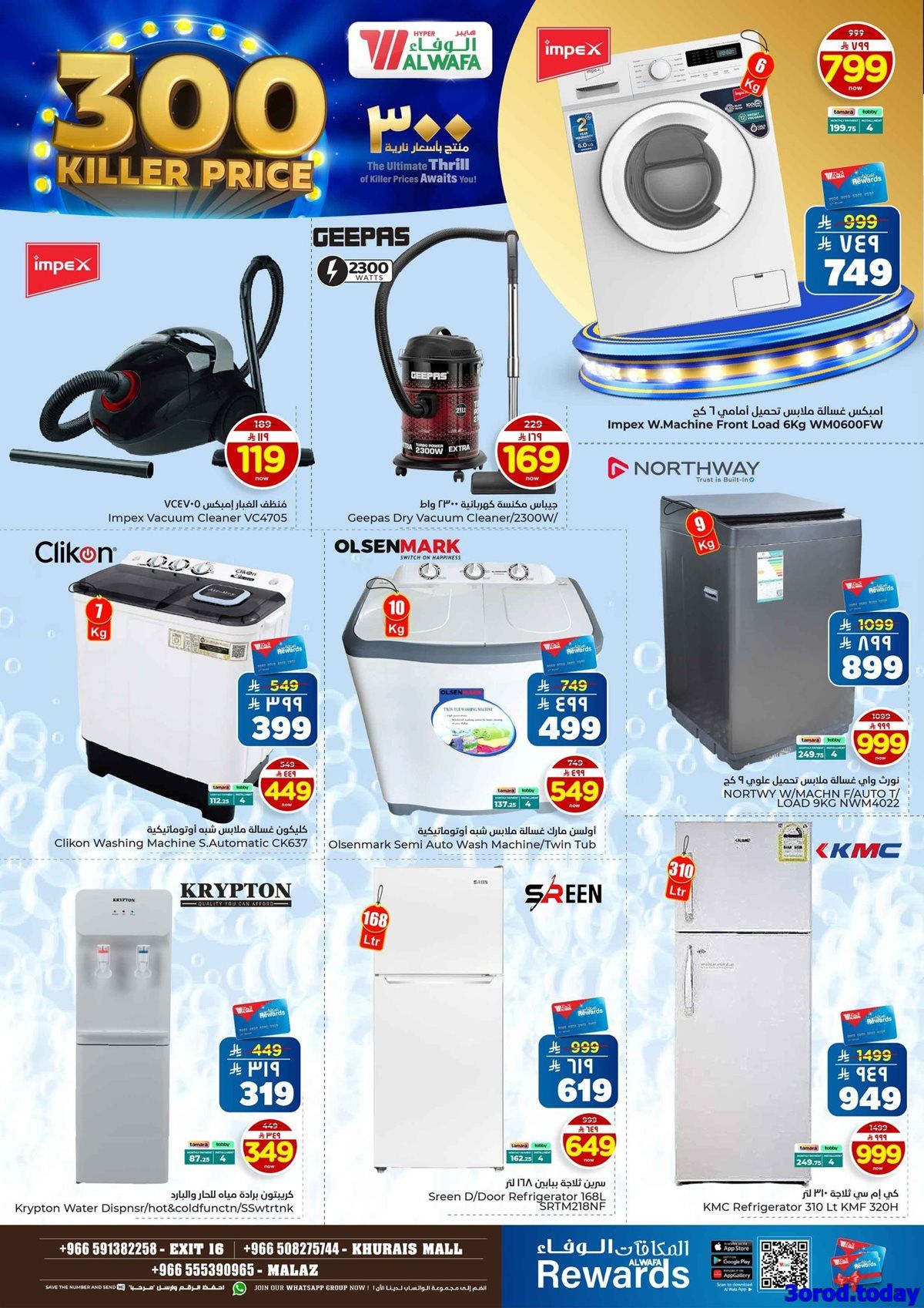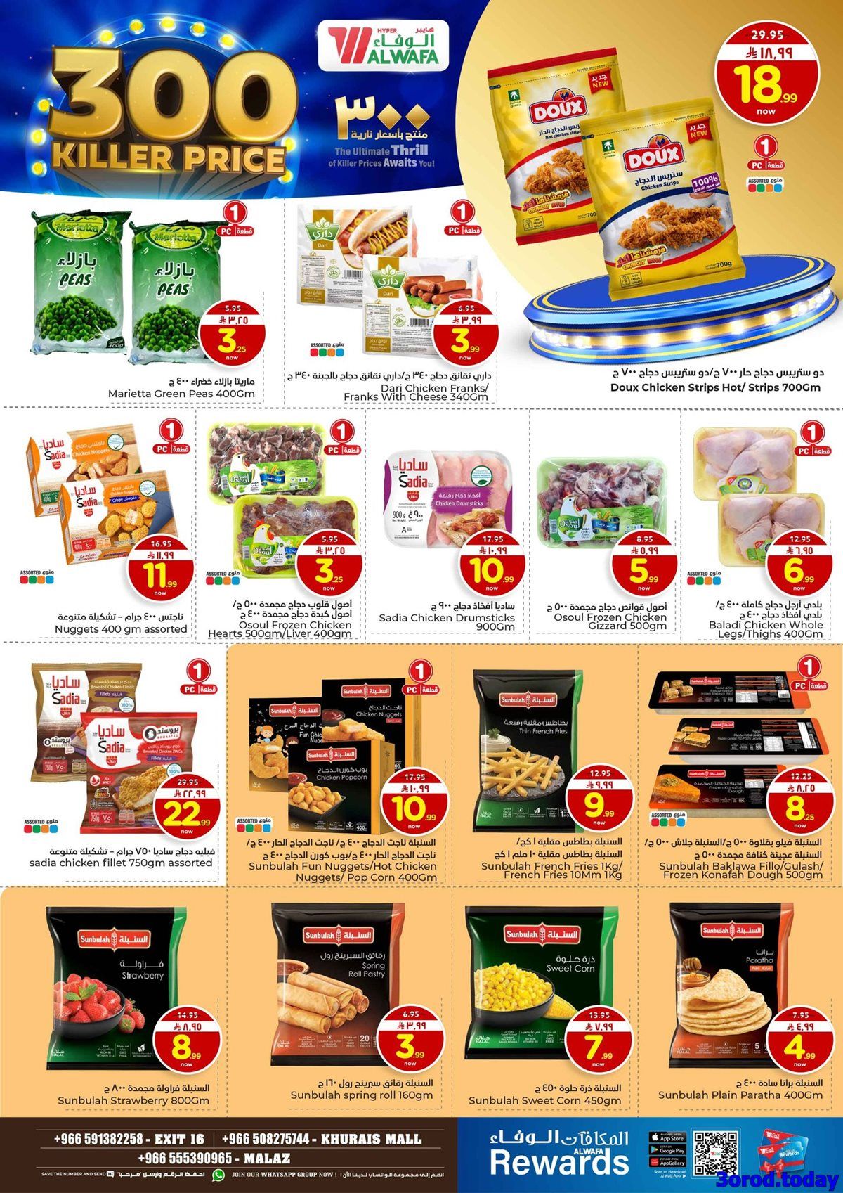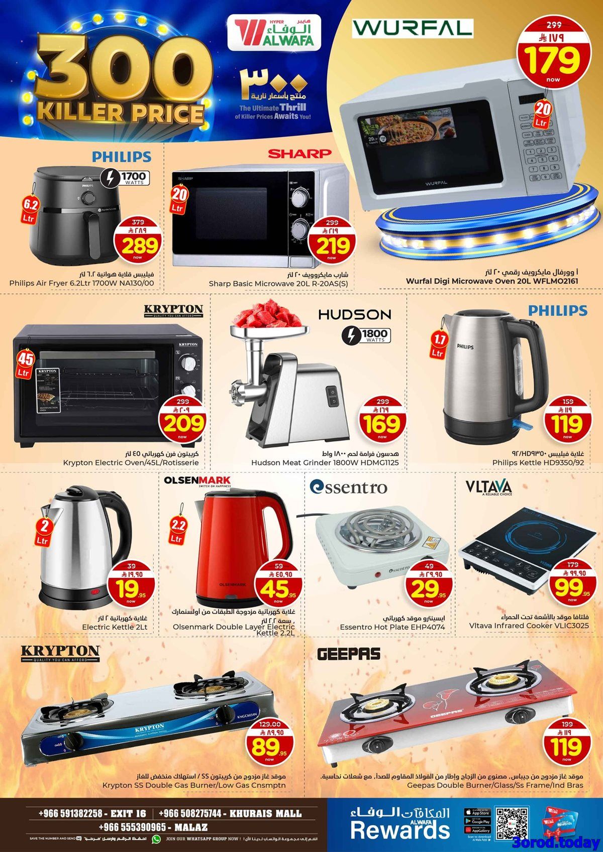 عروض الوفاء هايبر ماركت الأربعاء 18 رجب 1447هـ الموافق 7 يناير 2026 تضم الكرنب والبامية والطماطم والخوخ والعنب البناتي والحليب المبستر واللبن الرائب والجبن القابل للدهن وزيت الزيتون والمكرونة وصلصة الفطر ثم تمتد إلى الأجهزة مثل فرن كهربائي ومقلاة هوائية وصانعة وافل وخلاط سوائل وصانعة شوربة باسعار نارية