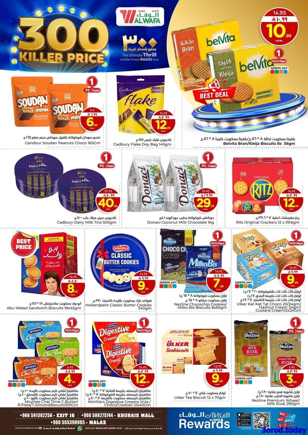 تشمل تخفيضات الوفاء هايبر ماركت علي : شوكولاتة سويت إي – لحم بقري هندي – لحم غنم نعيمي – لحم غنم تنزاني – لحم عجل باكستاني – دجاج حار وحار جداً – فخذ غنم باكستاني – قطع دجاج إنتاج – صدور دجاج إنتاج – فيليه دجاج الذهبي – دجاج تندوري – نقانق لحم بقري – كفتة لحم بقري – برجر بقري طازج – صابون هيمالايا – صابون رويال ليكسي