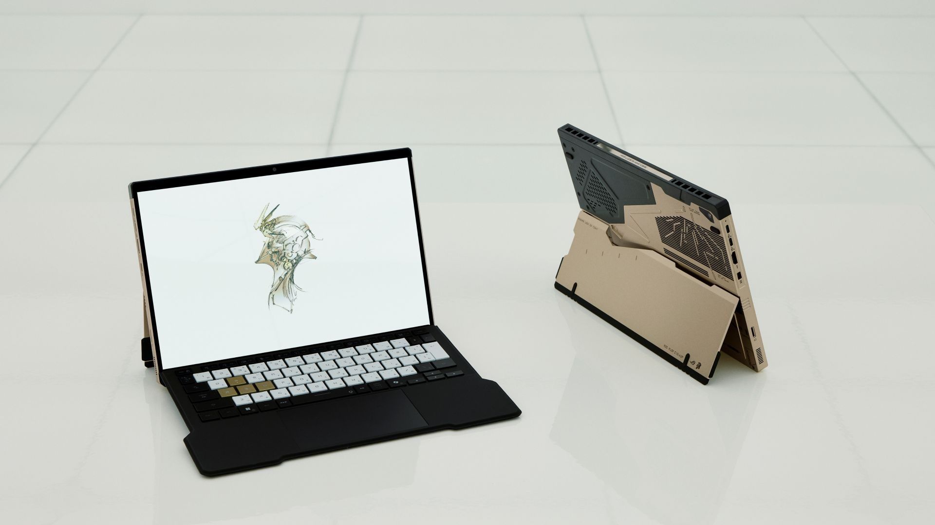 يأتي الحاسب Hideo Kojima-Themed ASUS ROG Flow Z13 – KJP بتصميم باللونين الذهبي والأسود مع عناصر مستوحاة من Kojima Productions، ويحتوي على معالج AMD Ryzen AI MAX+ 395، وبطاقة رسومية AMD Radeon 8060S، ومعالج NPU AMD XDNA بسرعة 50TOPS، وذاكرة موحدة بسعة 128 جيجابايت بتصميم رباعي القنوات.