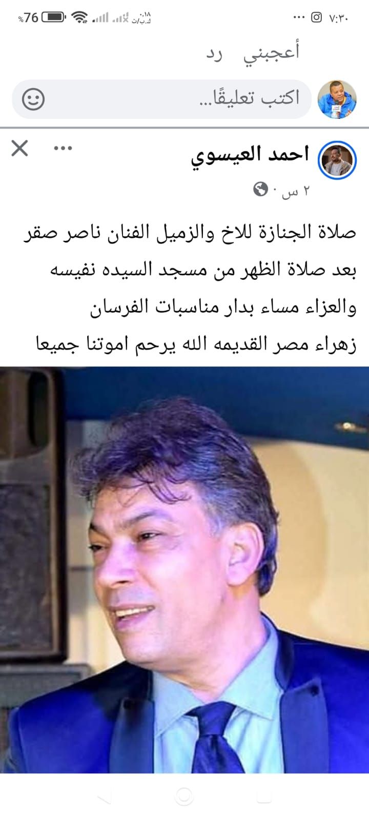 وكان قد أعلن مساء أمس الفنان مصطفى كامل نقيب الموسيقيين، وفاة المطرب ناصر صقر بعد صراع مع المرض، وعلق كامل على صفحته قائلا: "البقاء والدوام لله توفى إلى رحمة الله الأخ والزميل العزيز ناصر صقر اللهم ارحمه واغفر له واسكنه فسيح جناتك".