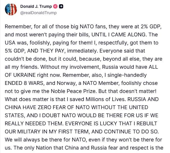 ترامب: أنهيت بمفردى ثمانى حروبحساب دونالد ترامب على تروث سوشيال