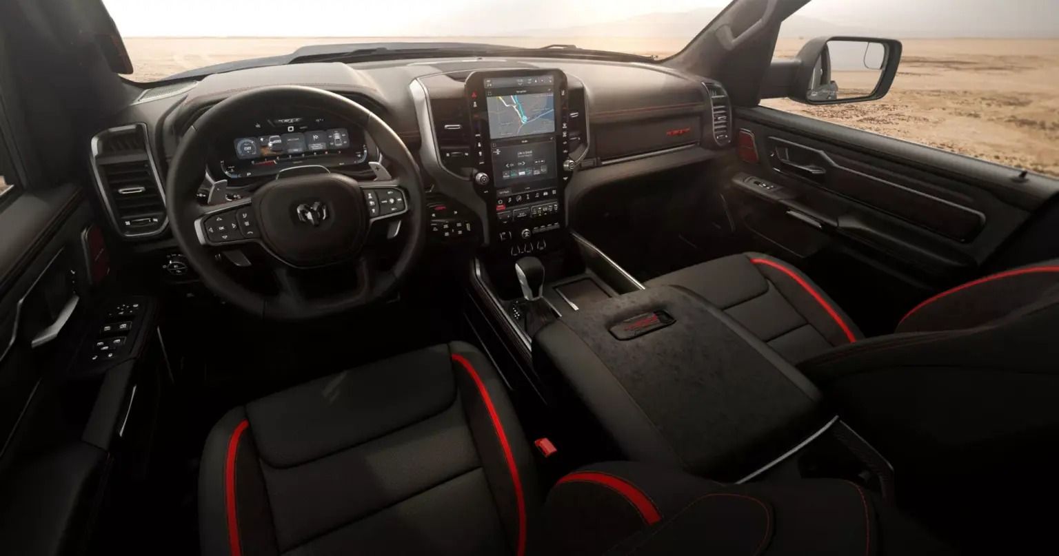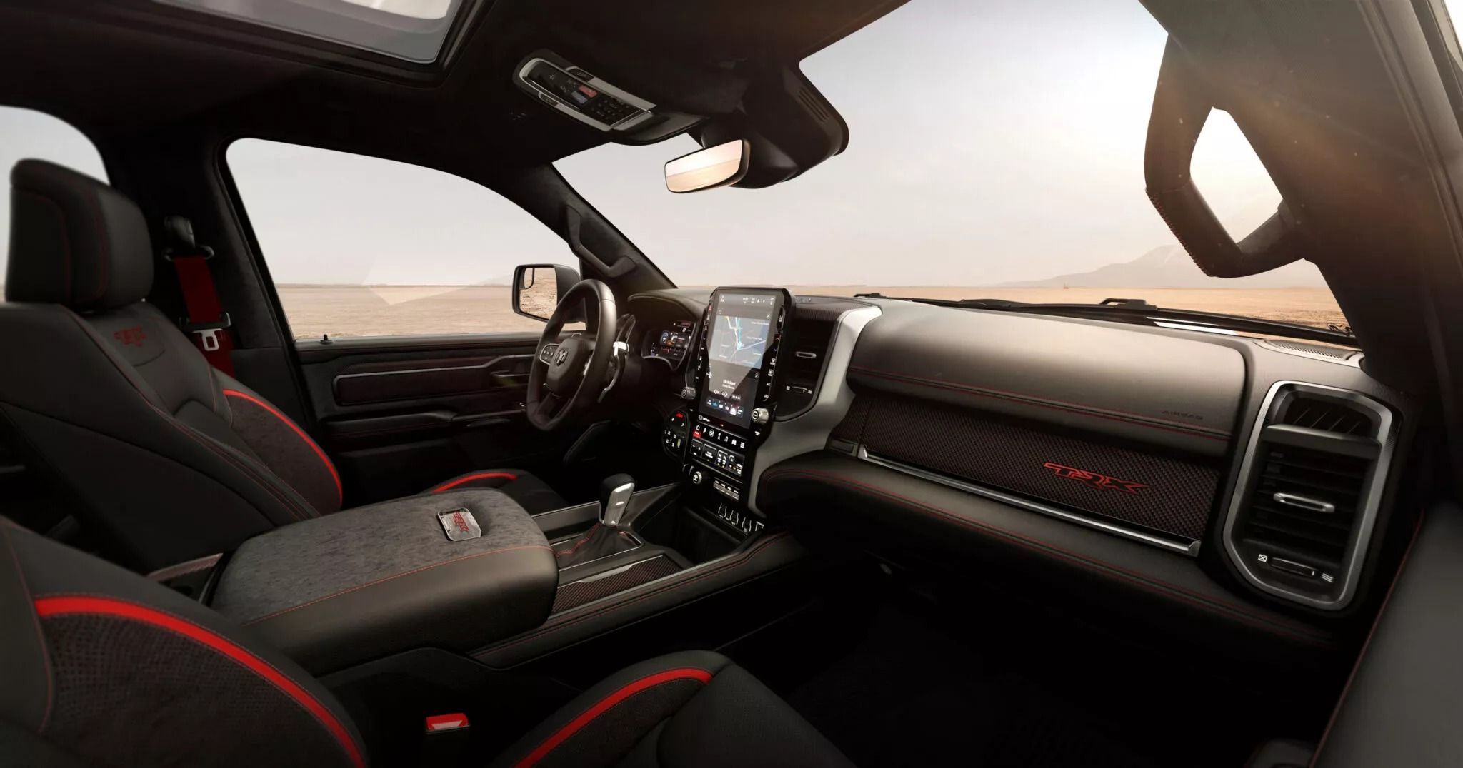 حصلت رام 1500 TRX على مقصورة متطورة تجمع بين الطابع الرياضي والرفاهية العالية، وتضم السيارة شاشة معلومات وترفيه كبيرة يصل قياسها إلى 14.5 بوصة، تعمل بنظام Uconnect 5، كما تتوفر شاشة رقمية أمام السائق بقياس 12.3 بوصة، تعرض مختلف بيانات القيادة بشكل واضح.