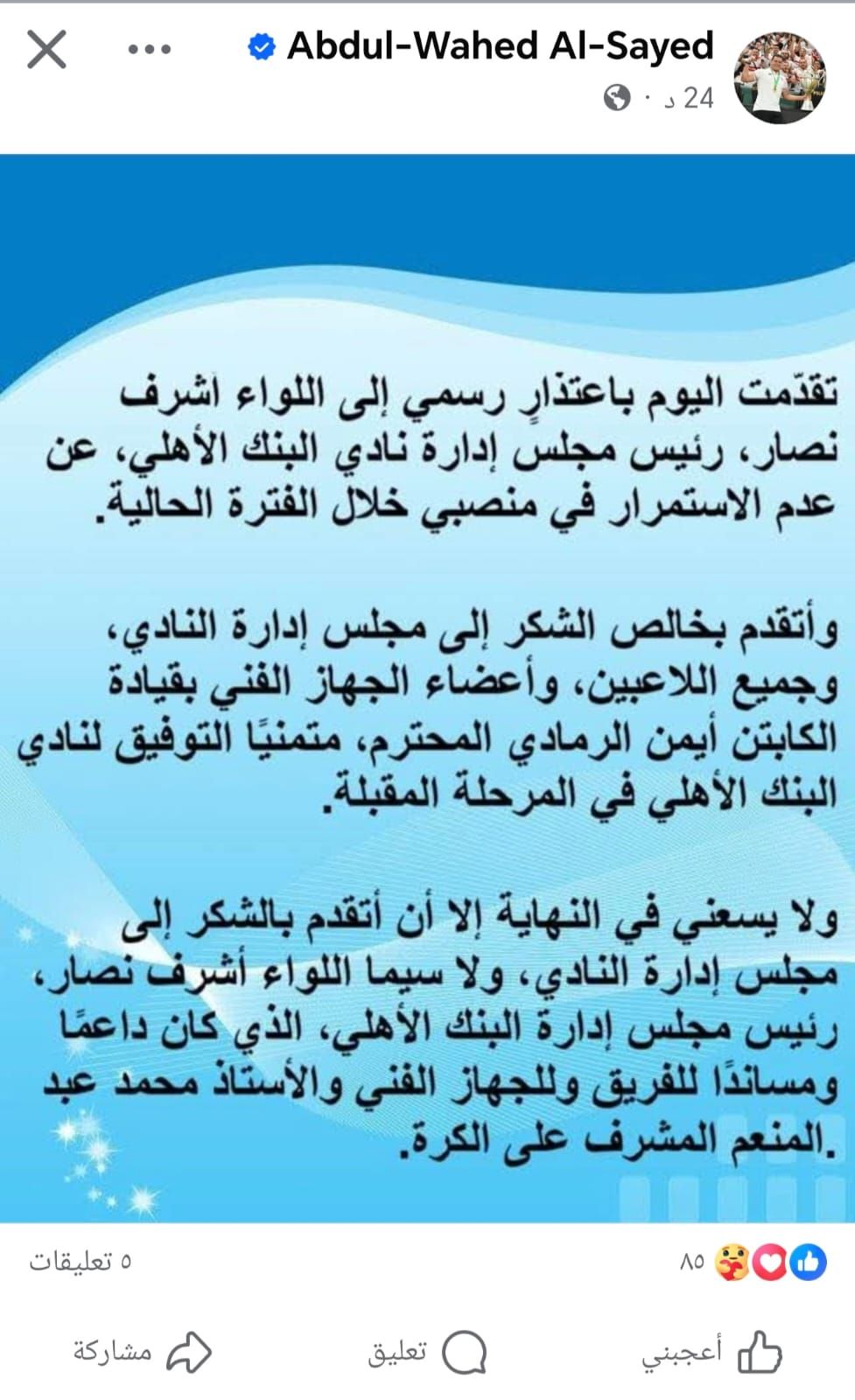 بيان عبد الواحد السيدوكتب عبد الواحد السيد عبر حسابه على فيس بوك: تقدمت اليوم باعتذار رسمي إلى اللواء أشرف نصار، رئيس مجلس إدارة نادي البنك الأهلي، عن عدم الاستمرار في منصبي خلال الفترة الحالية.