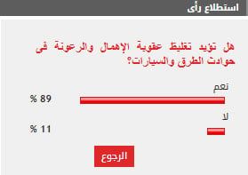 وأيد 89% من القراء مطالب تغليظ عقوبة الإهمال والرعونة فى حوادث الطرق والسيارات، بينما عارض 11% من القراء مطالب تغليظ عقوبة الإهمال والرعونة فى حوادث الطرق والسيارات.