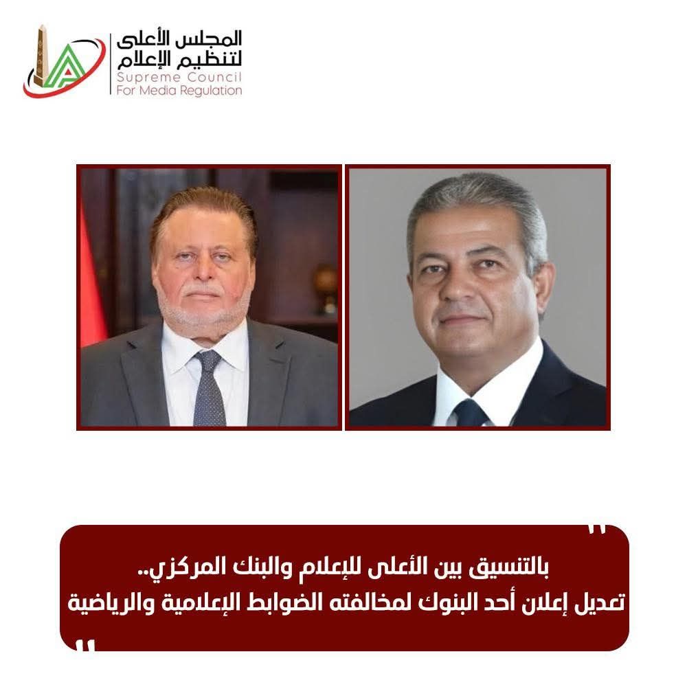 أعلن المجلس الأعلى لتنظيم الإعلام، تعديل إعلان أحد البنوك لمخالفته الضوابط الإعلامية والرياضية، وذلك بناءً على التواصل الذي تم بين المجلس الأعلى لتنظيم الإعلام برئاسة المهندس خالد عبدالعزيز، والبنك المركزي برئاسة حسن عبدالله.