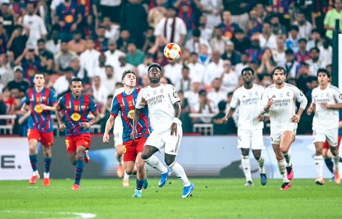 وقبل صافرة نهاية الشوط الأول، اشتعلت الدقائق المحتسبة بدل الضائع، إذ أدرك فينيسيوس جونيور التعادل لريال مدريد في الدقيقة 45+2، قبل أن يعيد البولندي روبرت ليفاندوفسكي التقدم لبرشلونة بعد دقيقتين فقط. ولم تكد الجماهير تلتقط أنفاسها حتى عاد الريال مجدداً بهدف التعادل عن طريق جونزالو جارسيا في الدقيقة 45+6، لينتهي الشوط الأول بتعادل مثير.