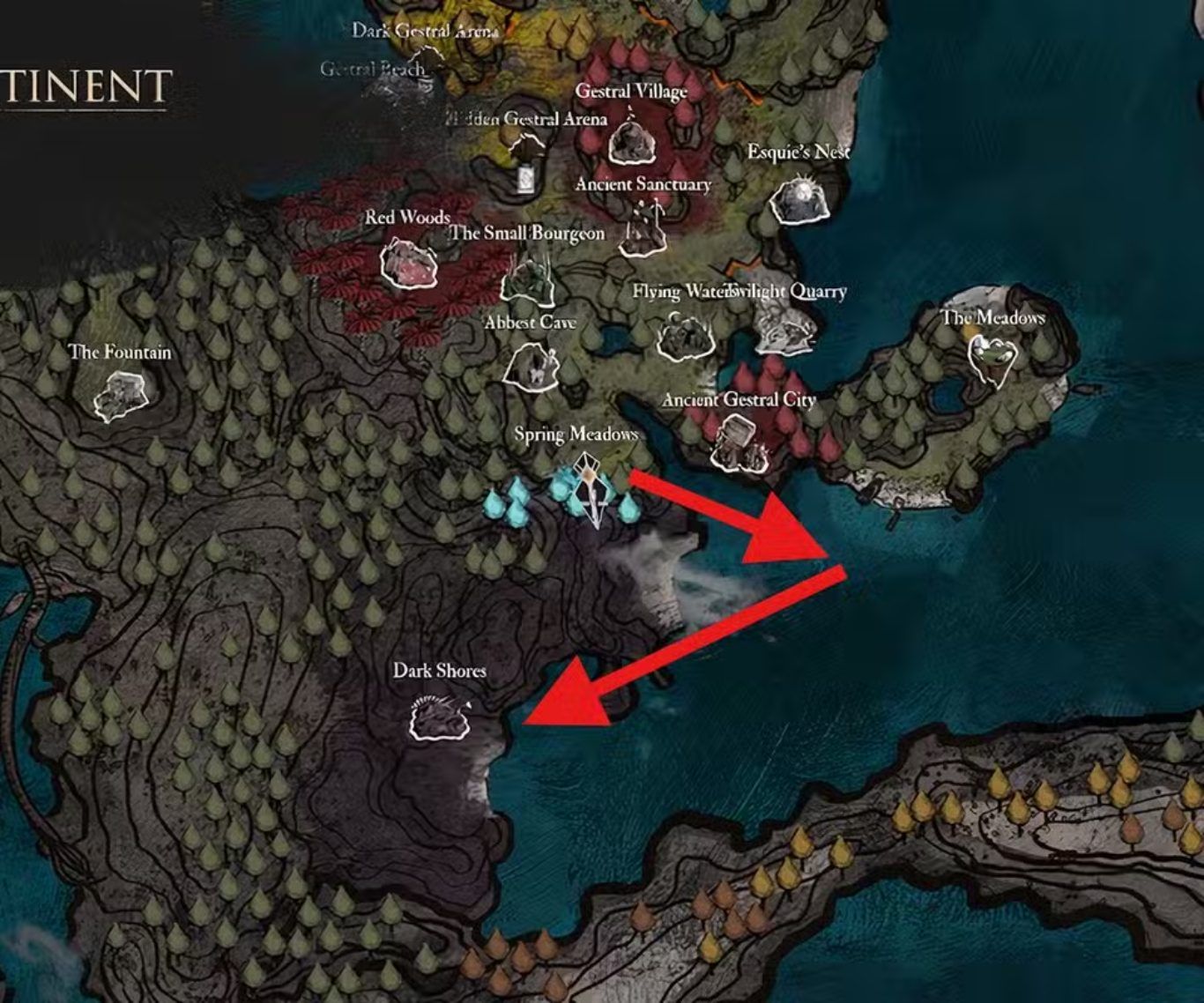 للوصول إلى Dark Shores يجب الانطلاق من مخرج منطقة Spring Meadows ثم التوجه شرقا باتجاه المياه مع مرافقة Esquie والاستفادة من قدرته على السباحة وبعد دخول المنطقة المائية ينصح بالالتزام بالسير بمحاذاة الجدار الأيمن بشكل مستمر دون الانحراف بعيدا حتى تبدأ معالم المنطقة بالظهور تدريجيا.