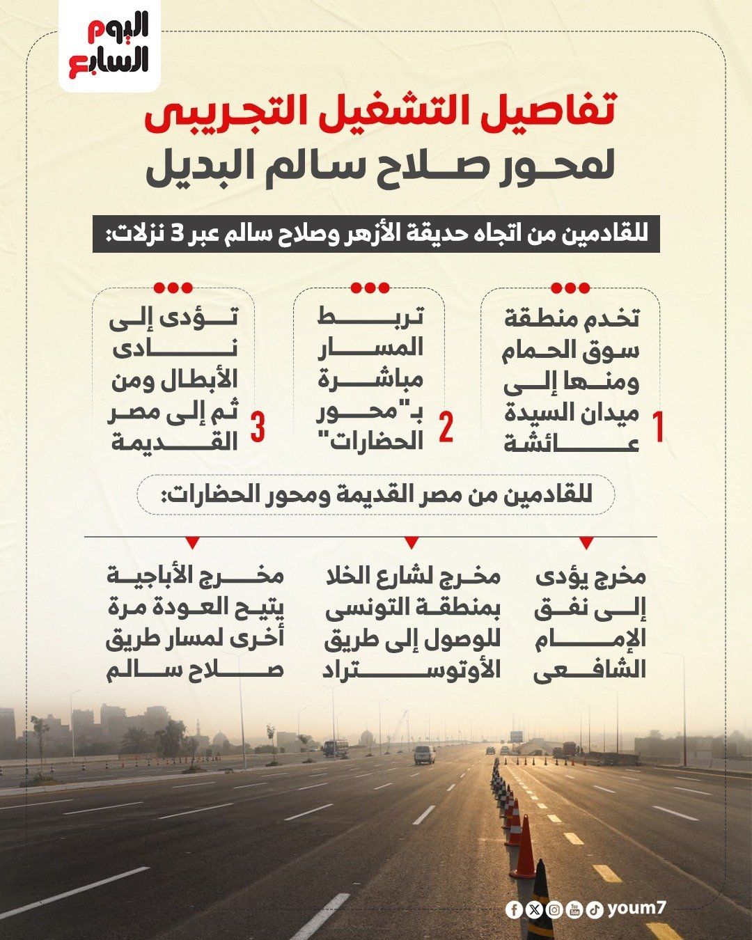 ​يتضمن المحور الجديد تصميمًا هندسيًا يتيح لمستخدمي طريق صلاح سالم التوجه إلى وجهاتهم عبر 3 نزلات رئيسية: