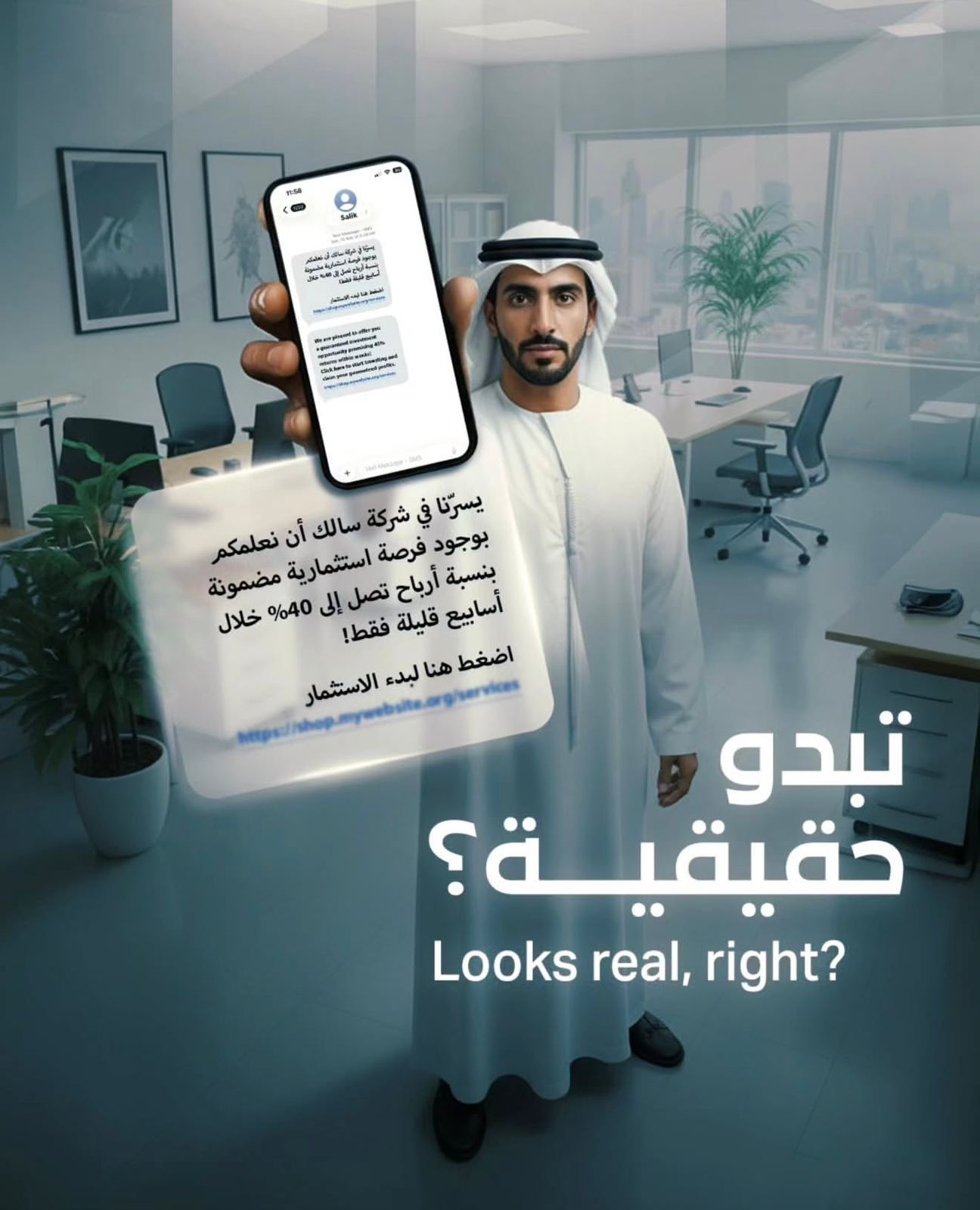 وعرضت «سالك» نموذجاً توضيحياً لإحدى الرسائل المتداولة التي قد تبدو حقيقية للمتلقي، وتروج لفرصة استثمارية مزعومة بعوائد مرتفعة خلال فترة زمنية قصيرة، وتستخدم لغة احترافية وتصميماً يوحي بالمصداقية، وجاء بنص الرسالة: "يسرنا في شركة سالك أن نعلمكم بوجود فرصة استثمارية مضمونة بنسبة أرباح تصل إلى 40% خلال أسابيع قليلة فقط! اضغط هنا لبدء الاستثمار.