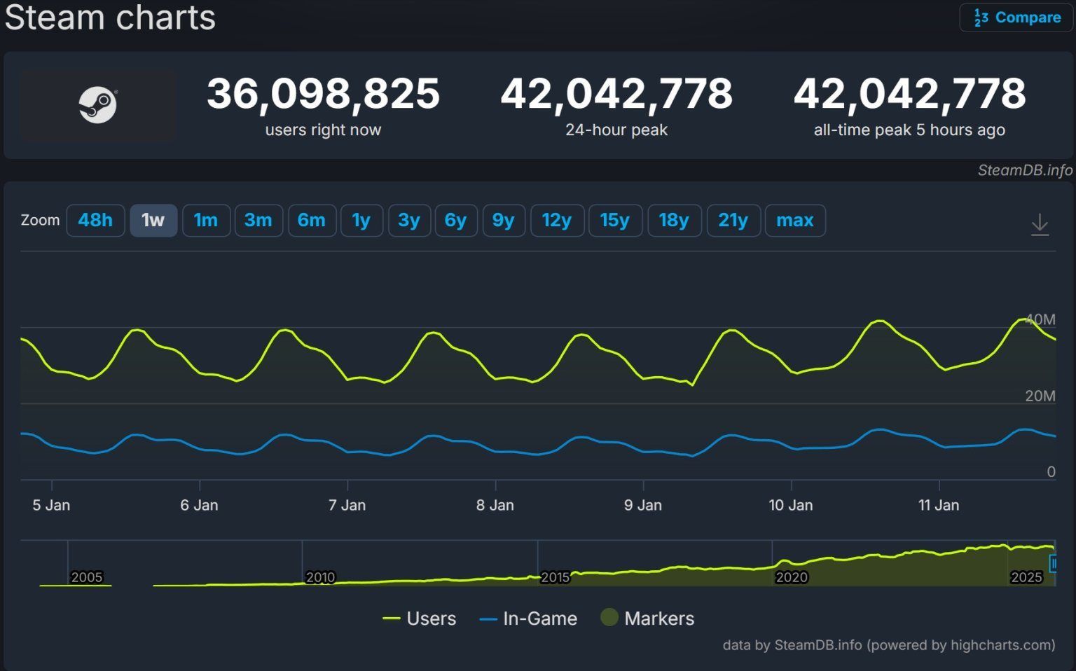 ستيم سجلت للتو رقماً قياسياً جديداً في عدد اللاعبين المتزامنين. في وقت سابق اليوم، تجاوزت خدمة Valve حاجز 42 مليون لاعب متزامن، وبالتحديد وصلت إلى 42,042,778 لاعباً. وهذا يوضح تماماً لماذا يسعى العديد من الناشرين إلى طرح ألعابهم على ستيم.