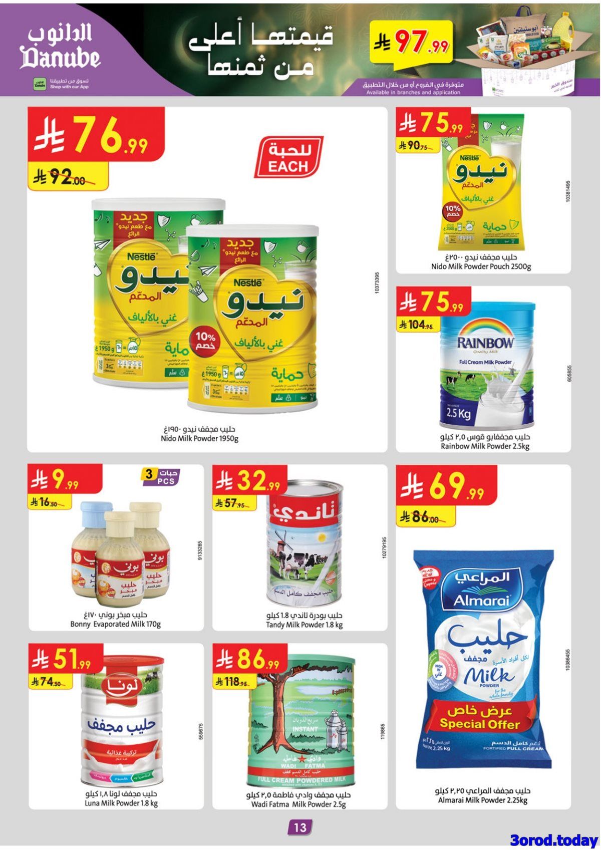 الدانوب المنطقة الشرقية الأربعاء 14-1-2026 الموافق 25 رجب 1447هـ تحتوي على تشكيلة من المنتجات الغذائية المتنوعة تشمل الربيان الجامبو واللحم الضأن المبرد وزيت دوار الشمس الصافي وأرز المزة ومعلبات الفطر المقطع وتستعرض العروض أيضا أجهزة منزلية منها ميكروويف بشواية وفرن كهربائي سعة متوسطة وقلاية زيت