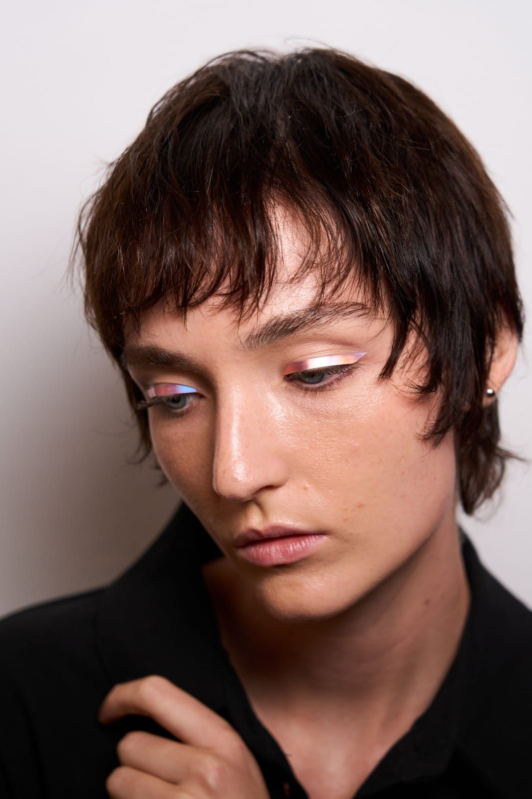 تعتمد هذه الإطلالة على ظلال عيون فضية مائلة للرمادي موزعة بخفة على الجفن. اللون يعكس الضوء بنعومة ويمنح العين اتساعاً وأناقة دون مبالغة.