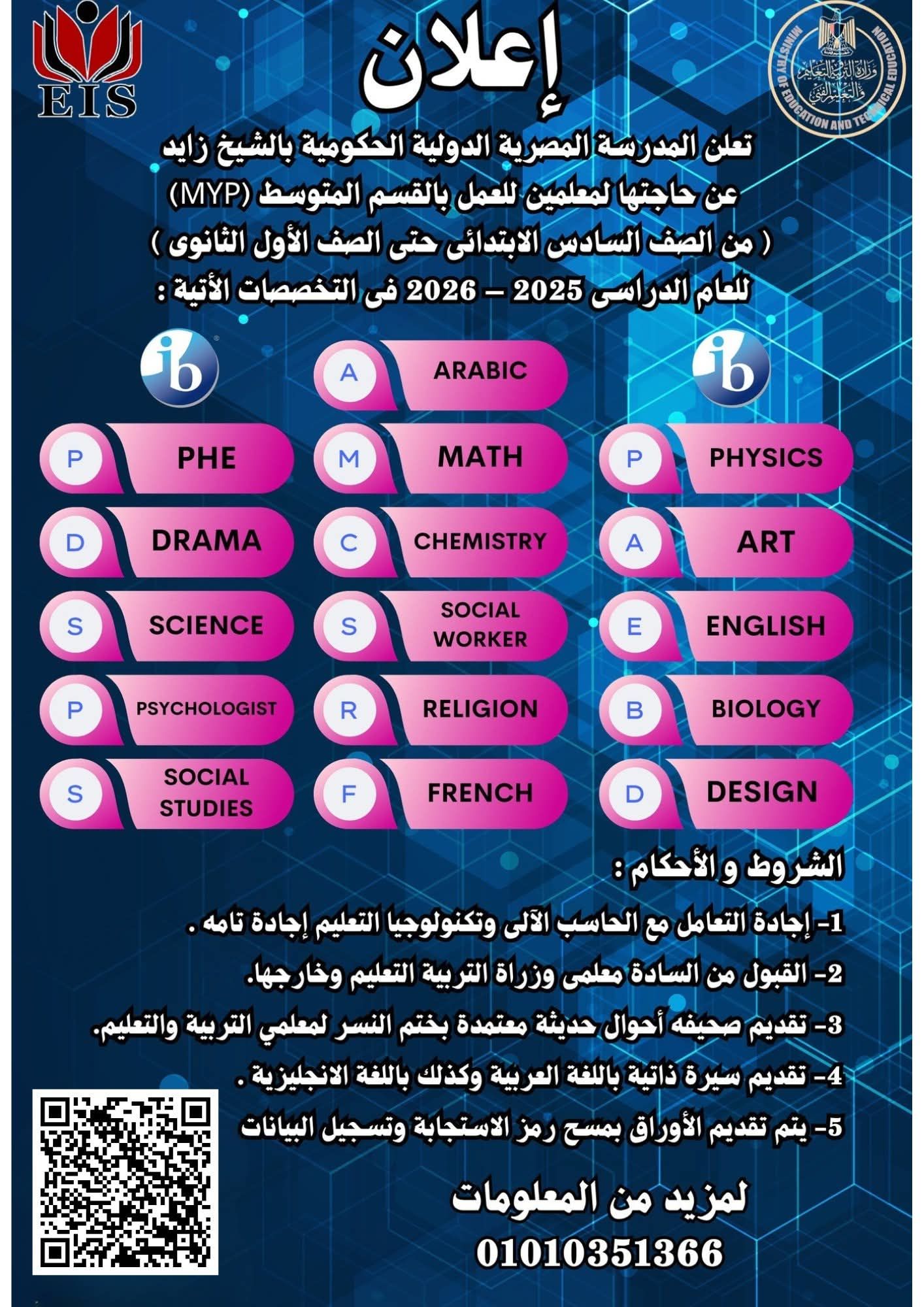الأربعاء، 14 يناير 2026 11:25 صأعلنت المدرسة المصرية الدولية الحكومية بالشيخ زايد، عن حاجتها لـ معلمين للعمل بالقسم المتوسط (MYP) ) من الصف السادس الابتدائى حتى الصف الأول الثانوى ) للعام الدراسي 2025 - 2026.
