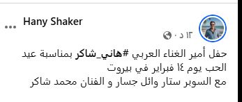 يستعد كل من النجم هانى شاكر والنجم وائل جسار و الفنان محمد فضل شاكر، لإحياء حفل غنائي في لبنان يوم 14 فبراير المقبل بالتزامن مع احتفالات عيد الحب، ولقد روج النجم هانى شاكر لهذه الحفل الاستثنائى على صفحته الرسمية فى أول ظهور له بعد الوعكة الصحية التى تعرض لها فى الأيام الأخيرة.