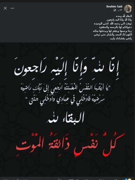 وكتب إبراهيم سعيد" البقاء لله وحده وانا لله وانا اليه راجعون توفت الي رحمه الله اختي الوحيده دعواتكم لها بالرحمه والمغفره ربنا يرحمها ويغفر لها ويدخلها جناته اللهم لك الحمد والشكر حتي ترضي راضي بقضاءك يارب".
