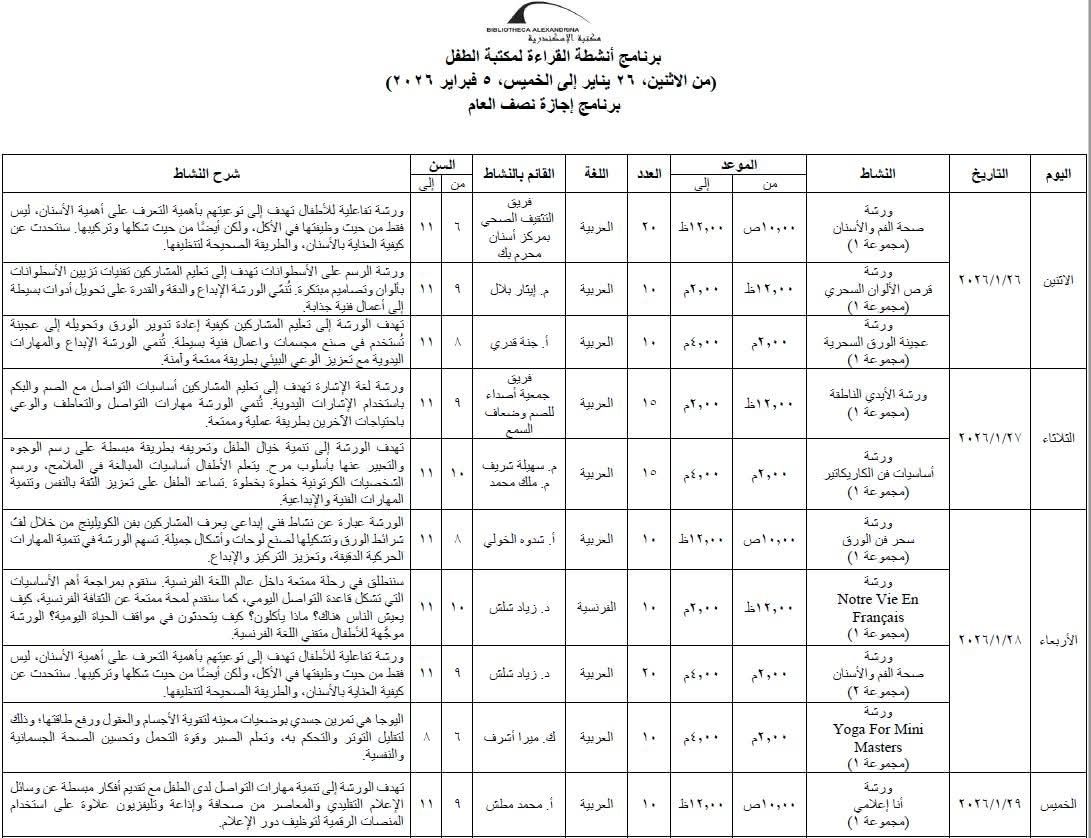 جدول برنامج الأنشطة لإجازة نصف العام بمكتبة الإسكندرية