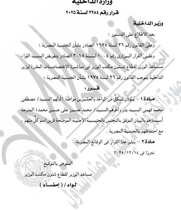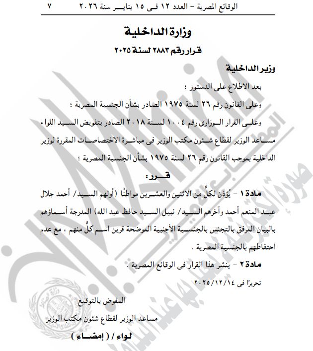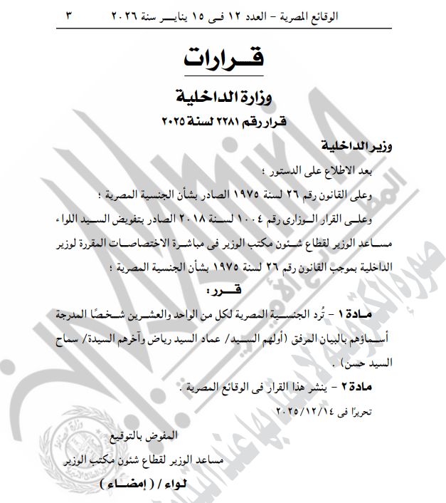 نشرت الجريدة الرسمية قرارات لوزارة الداخلية بشأن السماح لـ85 مواطنا برد الجنسية المصرية وكذلك بالتجنيس بجنسيات أجنبية مع احتفاظهم بالجنسية المصرية، وهم.