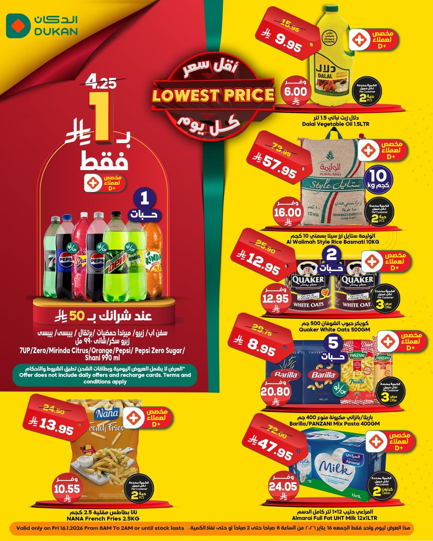 عروض الدكان الخاصة 16 يناير 2026 خربناها على الآخــــر على منتجات مختارة بأفضل الاسعار التي سوف تشاهدونها ضمن عروض نهاية الاسبوع في جميع فروع الدكان على المواد الغذائية العرض ليوم واحد فقط الجمعه 16 يناير 2026 من الساعة 6 صباحاً أو لحين تنفد الكمية
