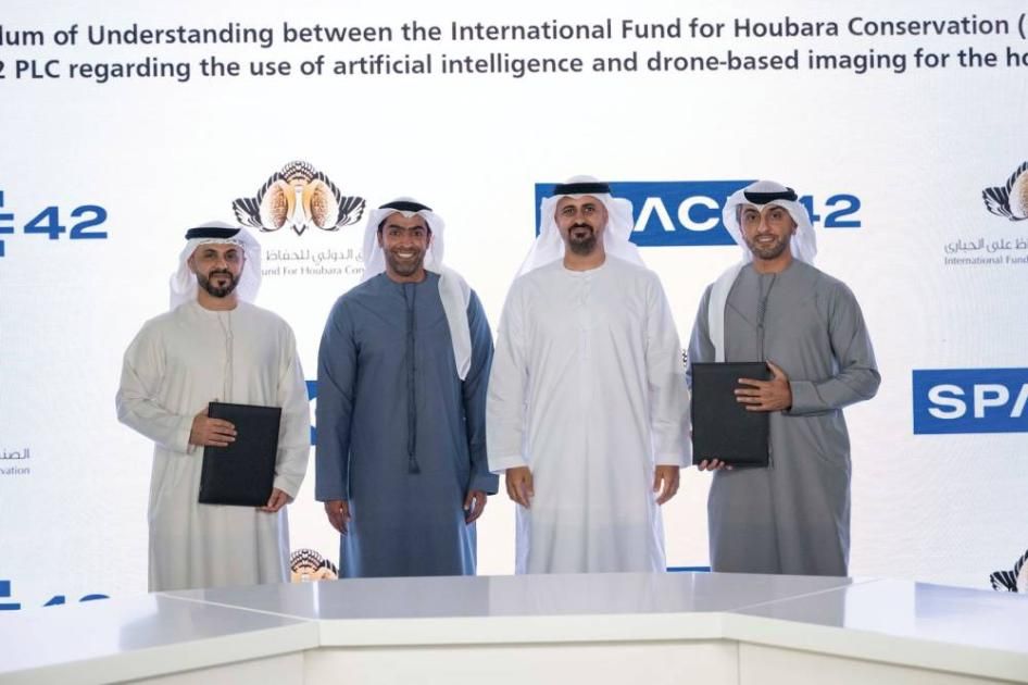 شهد سموّ الشيخ ذياب بن محمد بن زايد آل نهيان، نائب رئيس ديوان الرئاسة للشؤون التنموية وأسر الشهداء، رئيس مجلس إدارة الصندوق الدولي للحفاظ على الحبارى، توقيع مذكرة تفاهم بين الصندوق الدولي للحفاظ على الحبارى و«سبيس 42»، الشركة الإماراتية المتخصصة في مجال تكنولوجيا الفضاء المدعومة بالذكاء الاصطناعي، تهدف إلى تعزيز التعاون وتنفيذ أنشطة مشتركة للتصوير الجوي للحبارى باستخدام الطائرات من دون طيار وتقنيات الذكاء الاصطناعي.