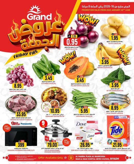 الجمعة الطازجة في جراند 16-1-2026 فقط على افضل المنتجات المختارة و بأسعار مميزه استفيدوا من التخفيضات المتوفره في جراند هايبر ماركت – الحمراء بلازا، المنصورة (مخرج 21) الرياض ضمن عروض مميزة مذهلة على المنتجات الطازجة