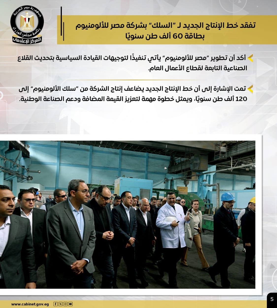 كما تفقد رئيس الوزراء خط الإنتاج الجديد لـ "السلك" بشركة مصر للألومنيوم بطاقة 60 ألف طن سنويًا، وأكد أن تطوير "مصر للألومنيوم" يأتي تنفيذًا لتوجيهات القيادة السياسية بتحديث القلاع الصناعية التابعة لقطاع الأعمال العام، وتمت الإشارة إلى أن خط الإنتاج الجديد يضاعف إنتاج الشركة من "سلك الألومنيوم" إلى 120 ألف طن سنويًا، ويمثل خطوة مهمة لتعزيز القيمة المضافة ودعم الصناعة الوطنية.