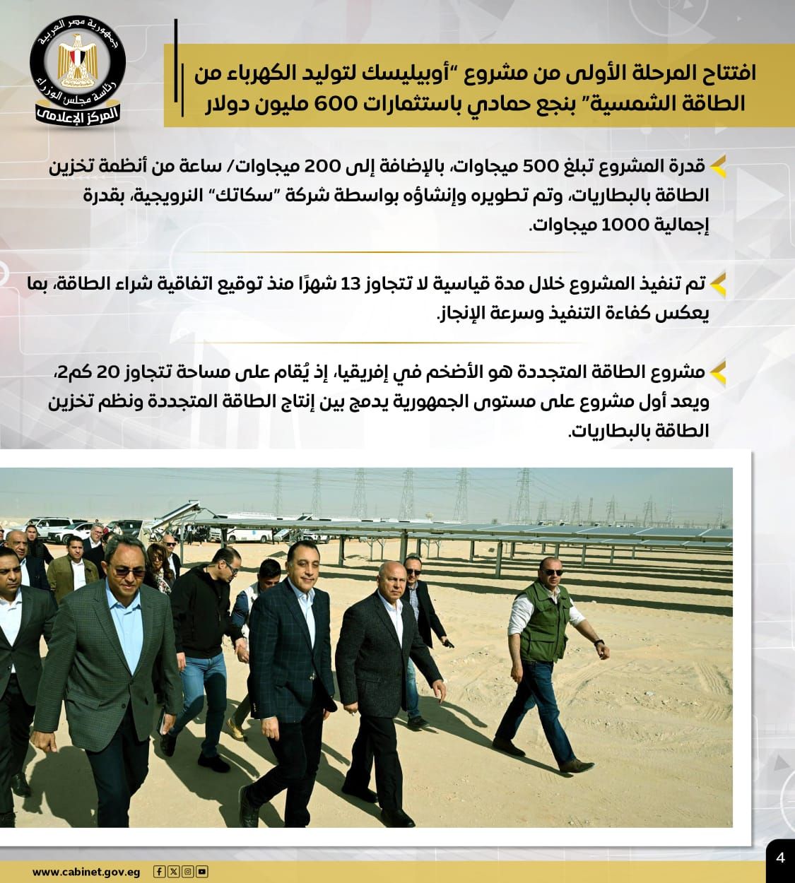 وافتتح رئيس الوزراء المرحلة الأولى من مشروع "أوبيليسك لتوليد الكهرباء من الطاقة الشمسية" بنجع حمادي باستثمارات 600 مليون دولار، وبقدرة تبلغ 500 ميجاوات، بالإضافة إلى 200 ميجاوات/ ساعة من أنظمة تخزين الطاقة بالبطاريات، وقد تم تطويره وإنشاؤه بواسطة شركة "سكاتك" النرويجية، بقدرة إجمالية 1000 ميجاوات.